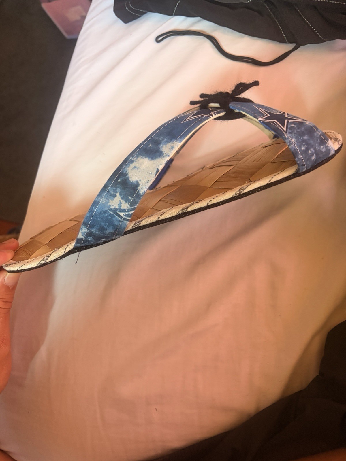 The Hawaiian House Slippers Lauhala are a pair of unisex slip-on house shoes perfect for casual occasions during the summer season. These blue slippers feature a Hawaiian theme and are made with lauhala as the upper material. With a standard shoe width and a slip-on closure, these slippers are comfortable and easy to wear for both men and women in US shoe size 9.5. Ideal for lounging at home or adding a touch of Hawaiian style to your casual outfit, these slippers are a must-have for anyone looking for comfortable and stylish footwear. *HAND MADE*