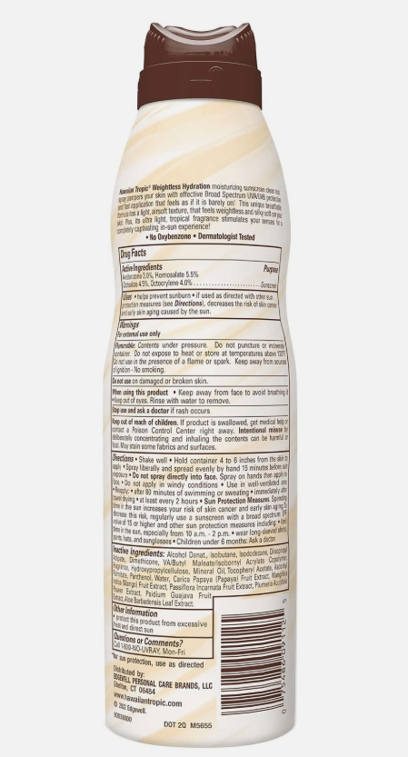 WEIGHTLESS & CLEAR SUNSCREEN SPRAY FORMULA looks and feels as if it's barely on CONTINUOUS SPRAY SUNSCREEN with a twist-lock top for fast, mess-free application SPF 30 CLEAR SUNSCREEN with 12-hour moisturization LIGHTWEIGHT AND NON-GREASY — Hawaiian Tropic Weightless Hydration won't weigh you down DERMATOLOGIST TESTED SPF 30 sunscreen WATER RESISTANT up to 80 minutes EXP 09/2026