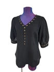 41 Hawthorn Lisbon Black Studded Sheer Blouse Short Sleeve Size Small Women's. In great condition 41 Hawthorne Lisbon Black Studded Sheer Blouse Short Sleeve Size Small Women's. Features lightweight sheer short sleeve blouse, brass studded details through neckline and sleeves, v-neck, falls at hips. Measurements laying flat chest 18.5" length 25" arm inseam 7" Fabric polyester This is a pre-owned item that may show signs of wear. In great condition, no flaws 14 Day returns accepted under the following conditions: Item must be in the same condition as stated If item shows additional wear buyer will receive a partial refund Buyer pays all shipping costs Refund amount will be for the item price only Please contact me prior to starting a return