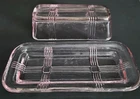 Vintage 1930's Hazel Atlas pink glass criss cross pattern butter dish. 6.75"W at base x 3 1/8"L. ***One small chip on the underside of the base*** Please see last photo. Otherwise in excellent condition.