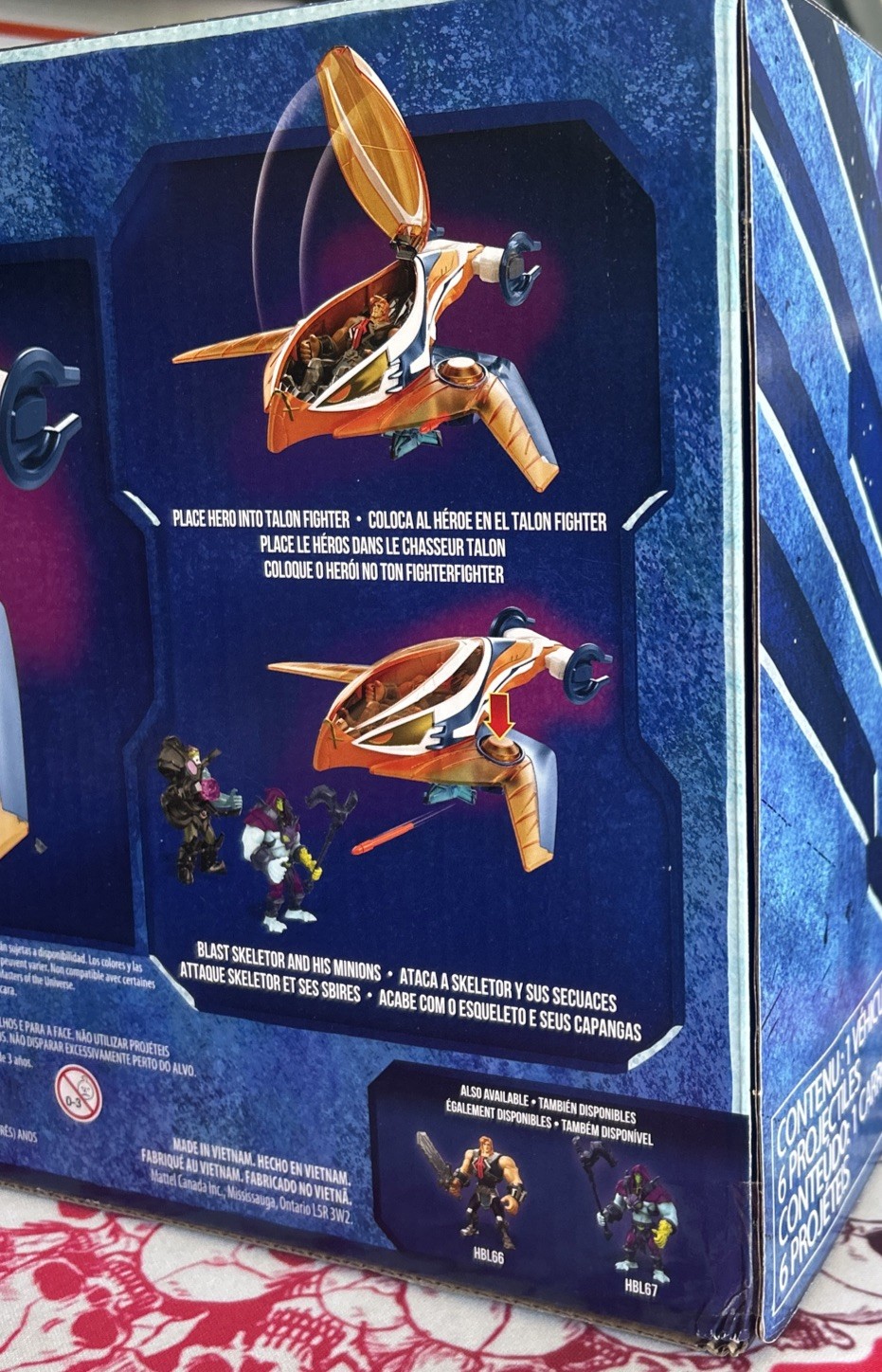 Signed:NoPersonalize:NoAge Level:5 +Time Period Manufactured:2020-NowFeatures:BoxedCountry/Region of Manufacture:VietnamFranchise:Masters of the UniverseYear Manufactured:2021Original/Licensed Reproduction:OriginalColor:MulticolorTheme:FantasyModel:Talon FighterMPN:HGW38gtin13:194735059041Character:He-ManItems Included:ProjectilesTV Show:He-Man and the Masters of the UniverseUPC:194735059041Brand:MattelSeries:The Original SeriesVehicle Type:Space ShipType:Vehicle
