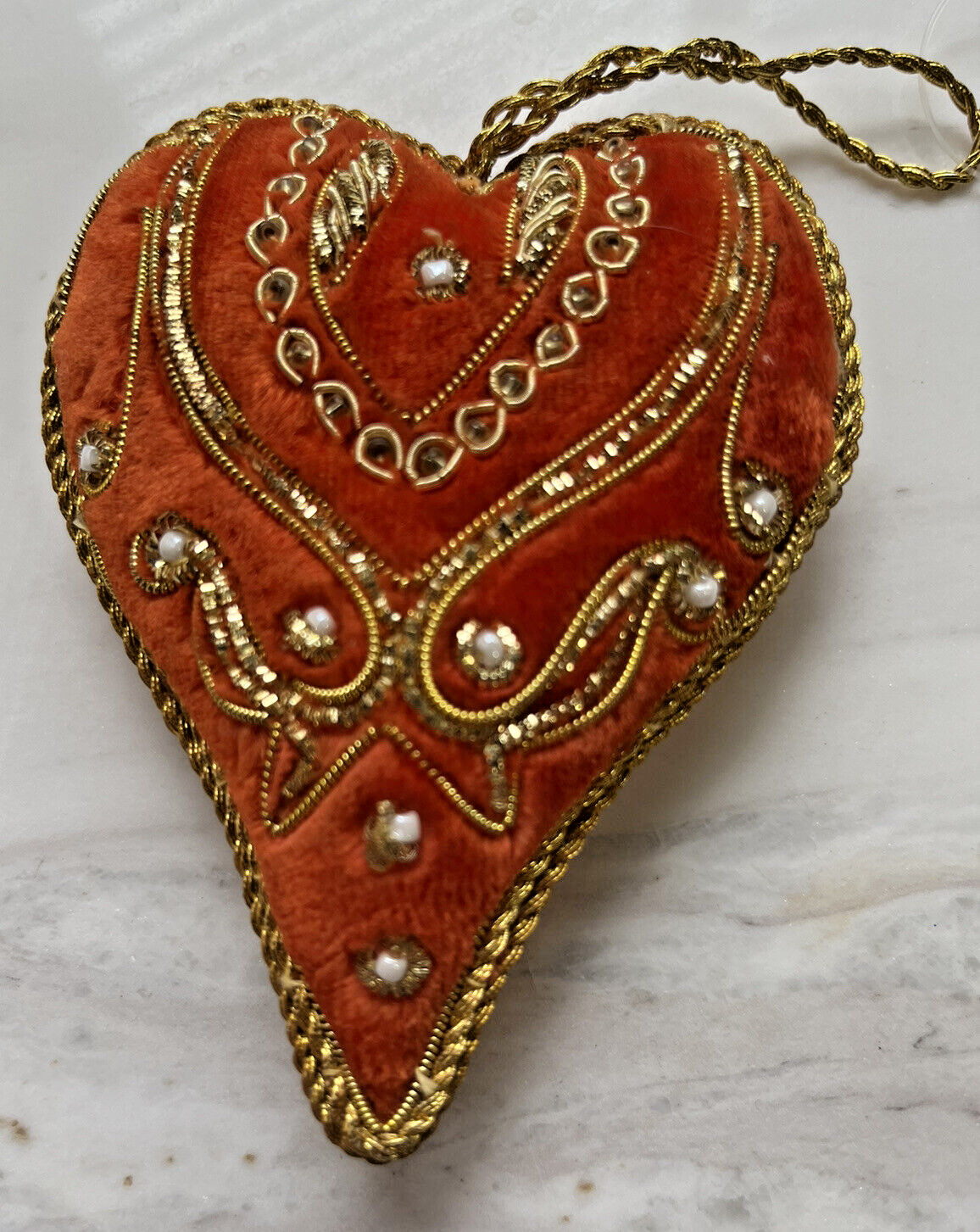 New Heart Christmas Ornament Holiday Embellished Rhinestone Velvet Orange Gold NWT 4x3.5 inch