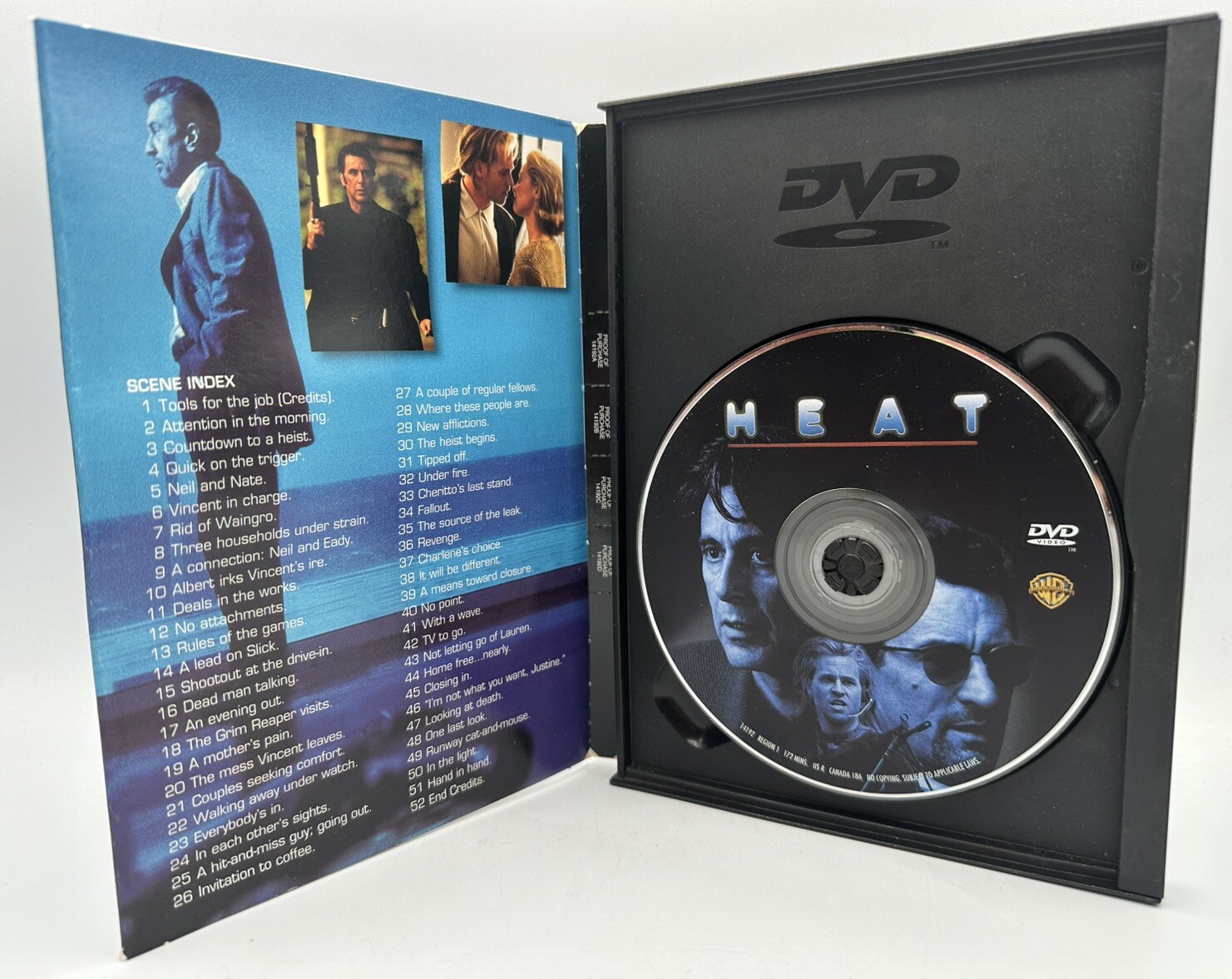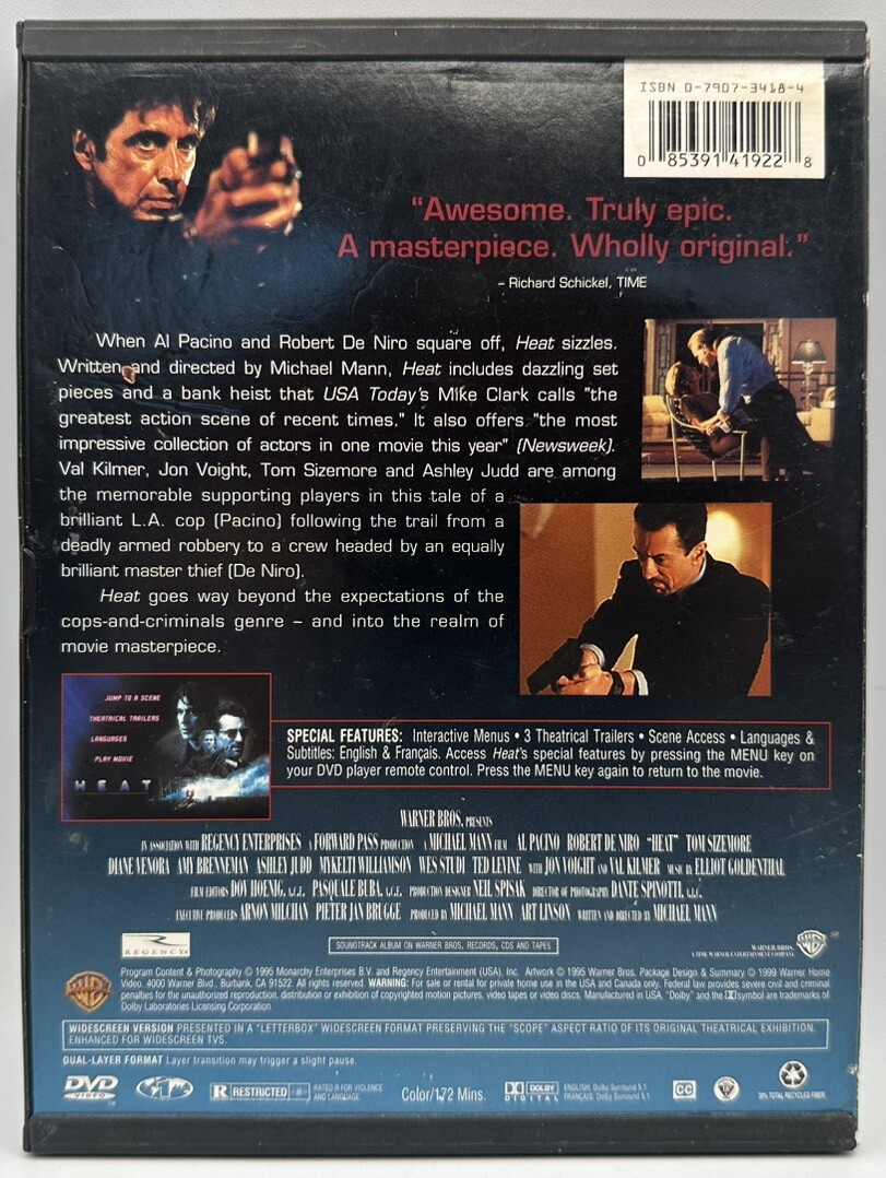 This is a "Heat" DVD from 2007 featuring Al Pacino, Robert De Niro, and Val Kilmer. Directed by Michael Mann, this drama film is in widescreen format with English and French subtitles. The DVD is in Tall/DVD Case packaging and has a runtime of 172 minutes. Produced by Michael Mann and distributed by Warner Bros, it falls under the Investigation, Mystery, and Buddy sub-genres with a Cult cinematic movement.
