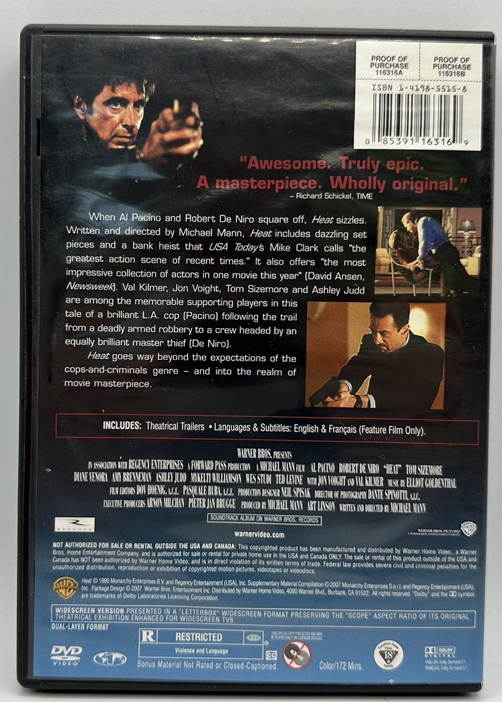 Experience the thrill of investigation, mystery, and buddy with the classic movie "HEAT" on DVD. Directed by Michael Mann, this cult cinematic movement film stars Robert De Niro, Al Pacino, and Val Kilmer. The DVD is a standard edition with a tall/DVD case and comes with subtitles in English and French. Rated R, this drama movie has a run time of 172 minutes and is in DVD format with region code 1 (US, Canada...). The DVD features widescreen and is produced by Michael Mann. Get your hands on this must-watch movie from 2007 and enjoy free shipping with your purchase.