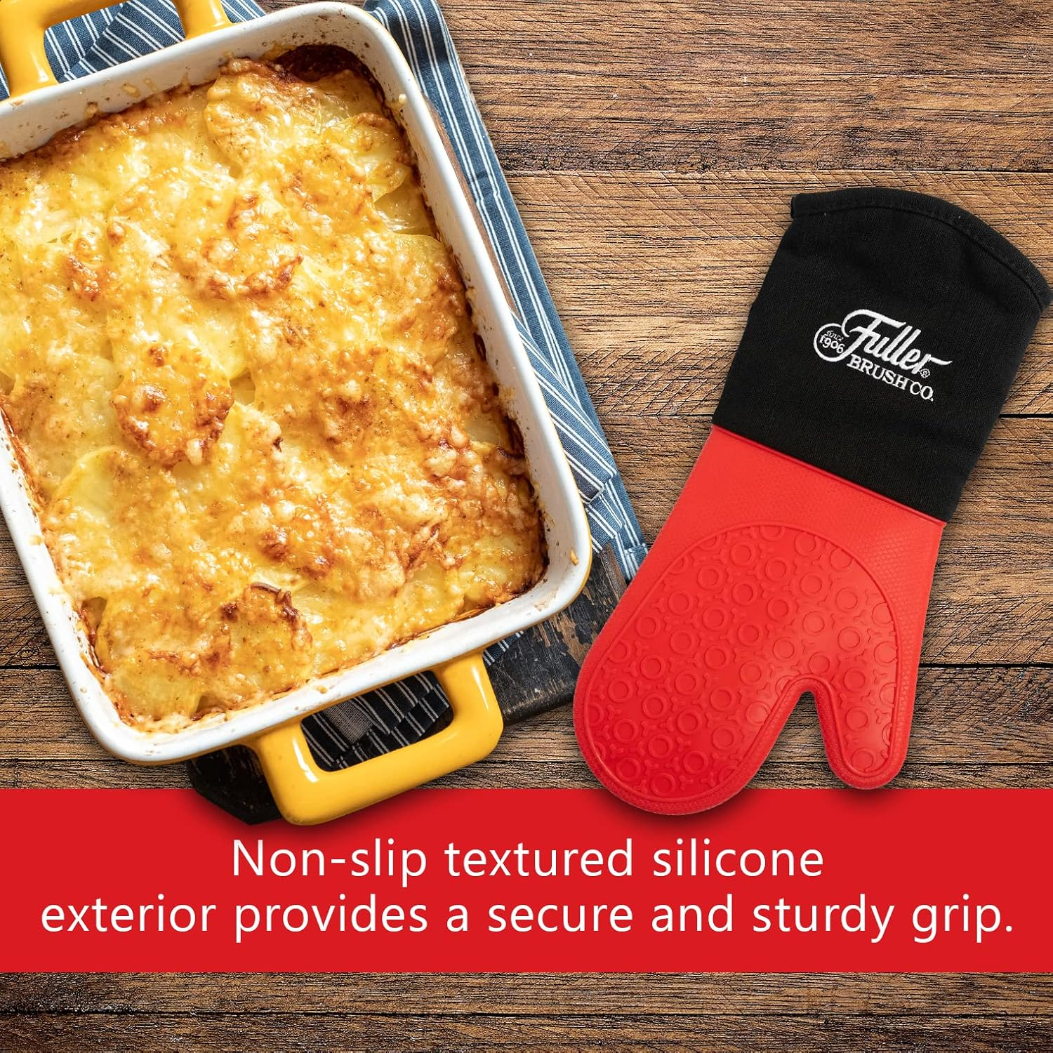 Silicone Oven Glove PROTECTION WHEN YOU NEED IT: Fuller Brush Silicone Oven Glove protects your hands and forearm from the hottest plates, pans, dishes, oven grates and more. The non-slip textured red silicone exterior provides a sturdy grip and heat resistance to 500 degrees. BEST DESIGN EXTRA LONG SLEEVE: The extra-long black sleeve extends additional distance up your arm for better protection on your wrist and forearm area. Glove measures over 14 inches in total length. EXTRA COMFORT: Fuller Brush Silicone Oven Glove is designed with an insulated quilted soft interior for added comfort and lined with polyester for extra durability. Glove can be used with right or left hand for convenience. MULTIPLE USES: In addition to protecting your hands and forearm around the oven, toaster and stovetop, this Silicone Oven Glove provides stylish protection while grilling with a barbecue or cooking with an outdoor smoker or pizza oven. TRUSTED BRAND: Since 1906, Fuller Brush has provided high quality, American-made products and unique imported products following Fuller’s strict quality specifications, which are designed to work and built to last. Whether you’re looking for cleaning tips or the specific cleaning products to do the job, Fuller Brush has you covered! Product Description Your Cleaning Supply Experts. Fuller Brush is focused on providing modern remedies for today's cleaning needs. With more than 115 years of cleaning experience, we have the know-how and expertise to provide you with cleaning supplies to make home cleaning much faster, better and easier. Using high-quality materials and expert construction, Fuller Brush offers a complete line of distinct, top-quality cleaning products. No matter what your cleaning needs are – whether you're looking for cleaning tips or the specific cleaning products to do the job – Fuller Brush has you covered! Protection From Heat Tired of wondering if a hot pad or short silicone glove will protect your hand and forearm? Many silicone mitts or gloves barely cover your hand to the wrist, which make it difficult to carry large plates or dishes with confidence. Fuller’s Silicone Oven Glove makes it easy to protect your hand and forearm from the hottest plates, pans, dishes, oven grates and more. The one-piece red silicone area protects your hand on both sides with heat resistance to 500 degrees. And, the extra-long Glove at 14.5 inches in total length helps protect your forearm when reaching into the oven or carrying large hot items. Quality Construction With Comfort Tired of losing your grip on a very hot pan or heavy casserole dish? The non-slip textured silicone exterior provides a secure and sturdy grip. The insulated quilted soft interior provides comfort and extra protection from the fingertips all the way up the forearm black cuff area, while the polyester lining provides extra durability. The Glove can be used with right or left hand for convenience. Fuller Brush Silicone Oven Glove Better Protection Every cook needs the protection offered by the Fuller Brush Silicone Oven Glove. Removing hot dishes and pans from the oven can be risky when using square potholders. Your hand can slip and contact the hot pan and your forearm is exposed to hot oven racks. Hot liquids and steam can cause burns when passing through or around fabric hot pads. The Glove’s one piece red silicone area covers your entire hand and will not allow hot liquids or steam to reach your hand, and the black cuff area covers your forearm to provide protection from steam while draining boiled pasta, potatoes or vegetables. Barbecue With Style Looking for heat protection while grilling with the barbecue, smoking meats or cooking with the pizza oven? This stylish Fuller Brush Silicone Oven Glove will protect your hand and forearm from the heat and flare-ups while flipping your favorite barbecue food on the grill or removing pizza from your outdoor oven. Conveniently hang this Oven Glove with the built-in hang-up loop. Over 115 Years Of Excellence Since 1906, Fuller Brush has provided high-quality products that are designed to work. Each product is made with the highest quality workmanship under strict quality standards. Whether you're looking for household or cleaning products, hairbrushes or personal care lotions, Fuller Brush has you covered. Item model number 55053-FB Item Package Quantity 1 Color Red Shape Hand Item Weight 5.9 ounces Outer Material Polyester, Silicone Fill Material Polyester Number of Pieces 1 Product Dimensions 14.5"L x 14.5"W Product Care Instructions Machine Washable. Avoid high heat settings. Air dry. 14.5 "w x 14.5 "w. Weight: 5.9 oz Shipping from the USA All of our products are shipped from the USA, ensuring quick delivery to your destination. Payment We offer the following payment methods: PayPal, credit card, bank transfer, and eBay's secure payment system. Free Shipping & Free Returns Shipping within the USA is FREE. Additionally, any return is absolutely free for you. Risk-Free Purchase You have the option to return an item within 30 days without any justification. We cover the return shipping costs! Fast Shipping We ship immediately upon receipt of payment. Generally, the package is delivered within 2-3 days in the USA. If it takes longer, we will contact you. Quality and Costs Made in Europe, USA, China No customs fees or additional charges Total satisfaction guarantee Invoice with declared VAT available upon request in .pdf format Feedback Your feedback is very important to us. After you pay for your purchase, you will automatically receive positive feedback from us.