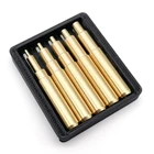 Heat-Set Insert Tips for M2 M2.5 M3 M4 and M5 Inserts. Compatible with Ha... M2, M2.5, M3, M4, M5 tips compatible with Hakko FX888D soldering iron Designed and manufactured in the USA Compatible with the Hakko FX888D irons. M2, M2.5, M3, M4, and M5 sizes. Greatly increase connection strength between 3D printed parts. Heat set insert installation tips compatible with Hakko FX888D soldering irons Strengthen and connect 3D printed and injection molded parts Heat set inserts are a great way to improve connection strength between 3D printed parts. Don't ruin your 3D printed part by messing up the insert installation. Our installation tips have a square shoulders and vertical walls that let them slide back out of the insert without catching or pulling the insert out accidentally. Long shank allows you to reach deep into 3D printed parts. Slender shank allows insert installation into tight corners without melting the side plastic. Vertical wall allows easy release of insert once installed. Square shoulder makes it easy to know if the insert is installed straight. A must-have for every 3D printer toolbox. Not intended for soldering. Soldering iron not included. How do you use heat set inserts? Design your part with holes for inserts Create your design with holes or pre-drill holes for where the insert is going to be placed. These holes need to be a little smaller than outer diameter of the insert and about 10-15% deeper than the length of the insert so that plastic will melt, deform, and mold around the insert properly. You may need to experiment with your 3D printer as some are not very accurate and the inserts themselves can have different outer diameters even if they are the same thread size. Heat iron to plastic melting temperature The hotter the iron, the faster the melt will happen. This may be desirable in a production environment. If you are a beginner, set the temperature right at the melting temperature of the plastic you're using or the extrusion temperature of your 3D printer. ABS - between 490 and 700 F PLA - 356F to 428F (180 - 220 C) If the plastic begins to smoke, lower the temperature. If no melt happens or too much pressure is required, raise temperature. Horizontal method-See listing video If an insert is placed onto the tip when the iron is horizontal, you can press the insert directly into the piece if you keep the iron horizontal. Because the tip is designed to not hold onto the insert, if the insert is placed on the tip and then oriented vertically, the insert will fall off. Holding the piece in one hand and using the iron with the insert on the tip in the other hand and pressing horizontally. This is our favorite method. Vertical method-See listing video If installing with the iron horizontal is not convenient or too difficult, you may need to install the insert in a vertical orientation. Place the insert over the hole it's going into first taking care to make sure the insert is sitting square over the hole. Use some needle nose pliers to hold it there, if you need to. Then use the tip of the iron and place it inside the insert and begin to lightly press down until the insert begins to melt the plastic and moves into position. Simply pull the iron straight back up and out when the insert is in the proper place. How do I replace the soldering iron tip with the insert installation tip? Unscrew the collar nut that holds the tip retaining sleeve Make sure the iron is turned off and cooled down. Turn the nut with the knurling counter clockwise to loosen until it's free. Take the nut off the iron by moving it toward tip end of the iron. Remove the retaining sleeve by pulling it towards the tip end of the iron. Remove the soldering tip which is over the ceramic heating element Simply slide the old tip off the ceramic heating core. Place the new insert installation tip over the heating element Guide the heating element into the 5/32" hole in the insert tip and position the tip as far down as it will go. Place the sleeve back over the tip and screw on the collar nut Place the retaining sleeve back over the wand. Bring the collar nut back over the sleeve and rotate the nut clockwise finger tight. Why use a specific size of tip? It's important to pair the correct size of tip with the size of insert you are using. If the tip is too small for the insert, plastic will come back up inside the threads making it very difficult to turn your screw into the insert. Many times your part can be ruined because it's difficult to replace an insert if the surrounding plastic is deformed. We created these specific sizes because they are some of the most popular sizes and they are precision machined to be exact fits with just enough clearance that they don't pull the insert back out, but not so much clearance that plastic comes inside the threads. The right tool for this job requires the right size tip and this set has the most popular metric sizes. Common questions Where can I find inserts? Search for "Heat set inserts". It's best if you use the "conical" shaped inserts, those with a wider top than bottom. Those are the inserts designed for heat-set. I don't have a Hakko FX888D There are hundreds of iron types and even more tip types. If it is a Weller SP40NUS these tips will fit. If you have a Weller WES51 we have a model of ET Series tips that will fit that iron. Search for ASIN# B08LQTD21D. How long are these tips? Total length on these tips is 1.6 inches or 40.6 mm. On a Hakko FX888D these tips reach 0.66" or 16.8 mm from the end of the collar. Spacing required underneath? Make the insert hole deeper than the insert itself because the insert is melting its way into the plastic and needs space to move. If the hole is not deep enough the plastic the insert is melting on its way down has nowhere to go. In the worst case scenario plastic may seep back into the center making it difficult to put a screw in or mound around the insert at the top edge. We try to make the hole at least an additional 1/3 