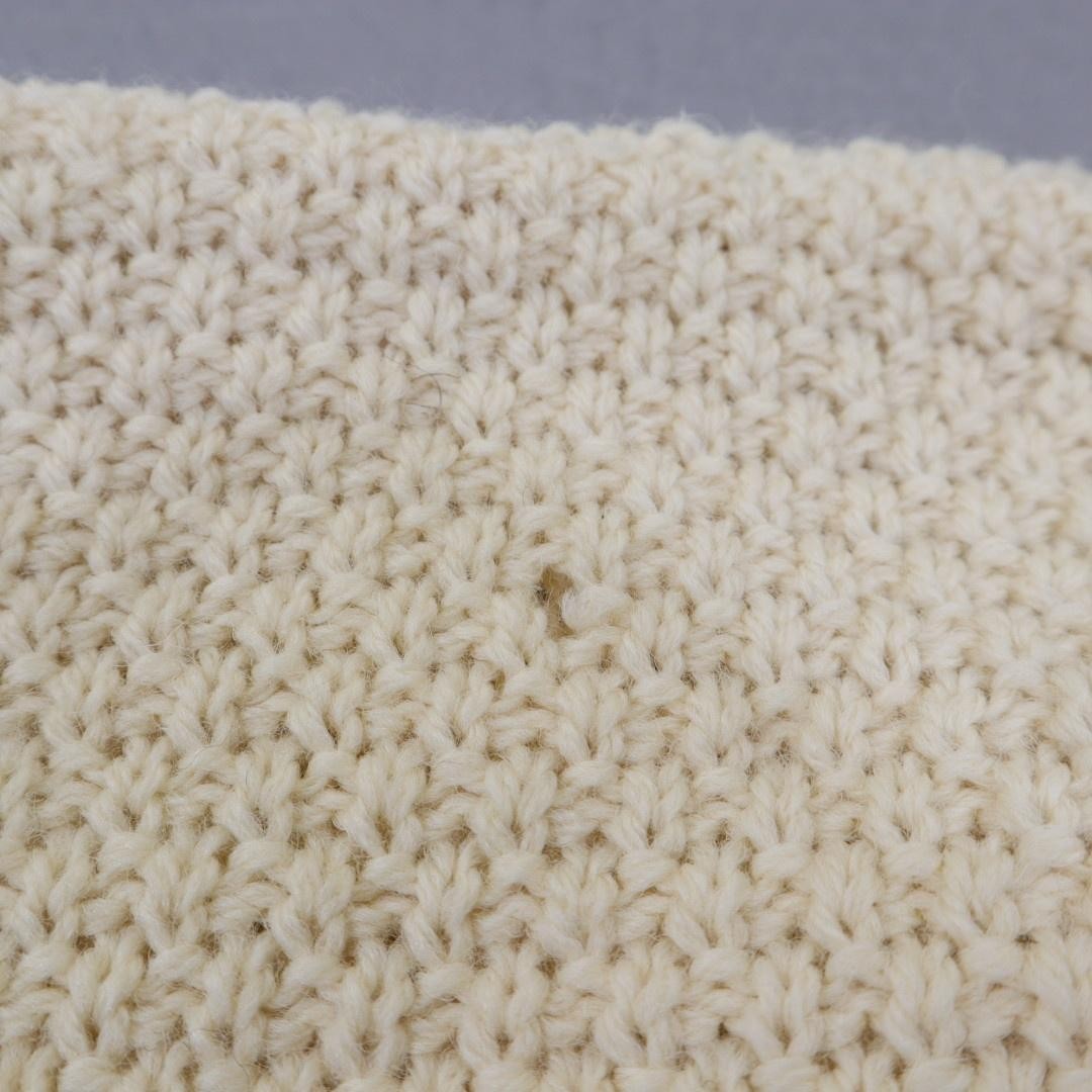 Brand: Heather & Tweed Item: Womens button-front cardigan sweater with deep V-neck and classic cable knit design. Color: Cream / off-white. Material: 100% pure wool; Made in England. RN 75343. Size on tag: Medium (M). Design details: Chunky textured cable and seed-stitch knitting, five dark brown buttons, ribbed cuffs and hem, two front patch pockets. Care: Hand wash cold separately, do not bleach, do not twist or wring, reshape and dry flat (per care tag). Notes: Warm heavyweight wool cardigan ideal for layering in cool weather. Flaws: Light overall pilling and a few small darker specks in the knit as shown in photos.