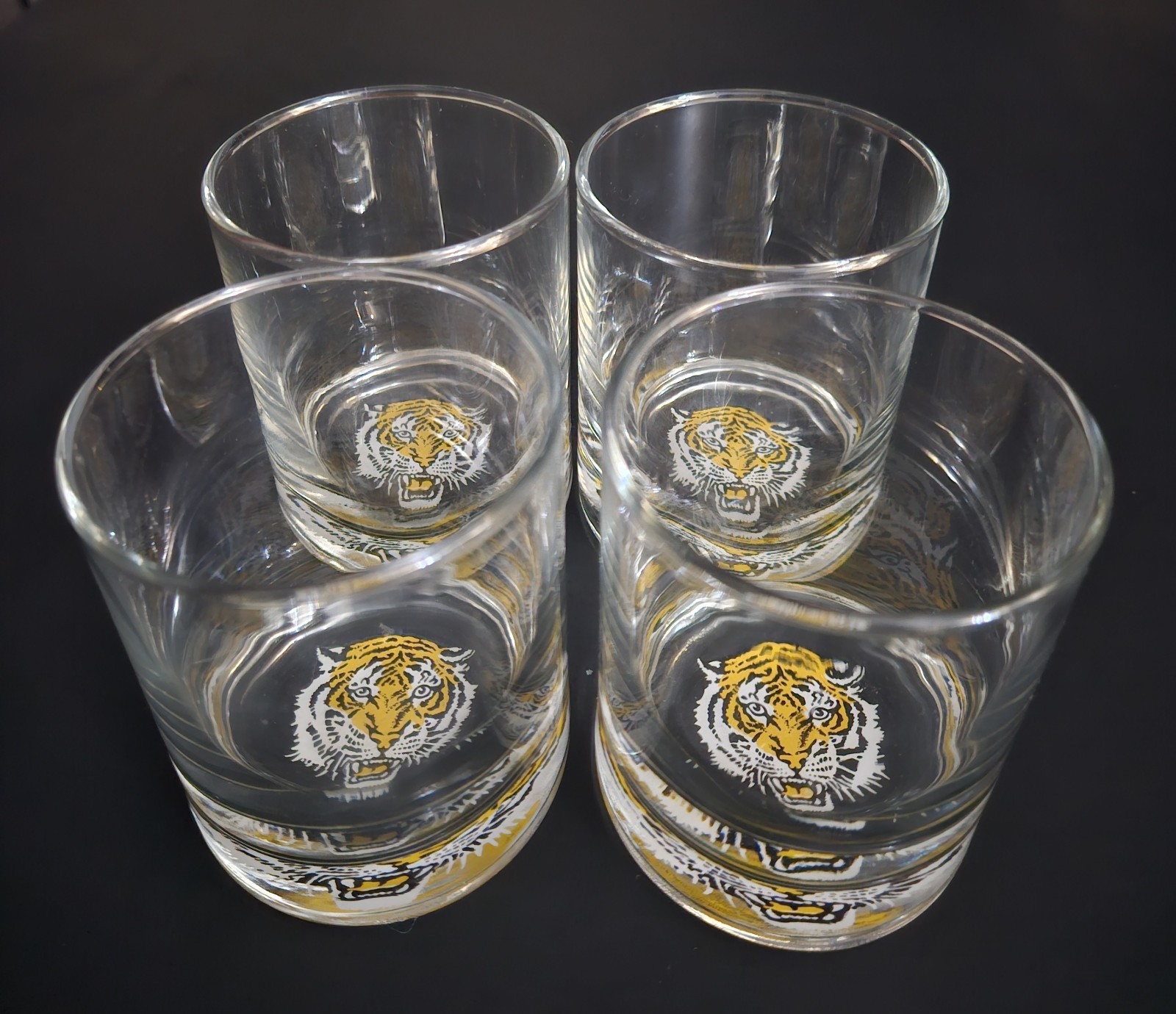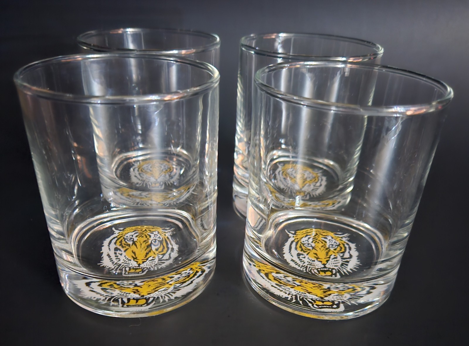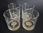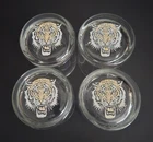 Set of four heavy bottom lowball whiskey/ juice glasses with a tiger logo on the bottom. 3.5"H x 2.75"W at opening. I am not sure who the maker is. There are a few other sets like these listed as Libbey on Ebay but without the traditional L mark on the bottom I do not feel confident listing them as such. No chips, cracks or damage. In excellent condition.