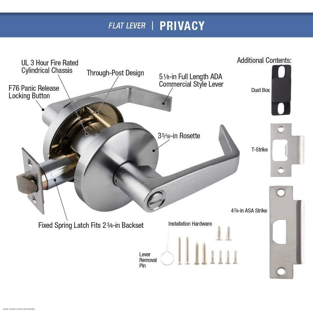 Contact Us Add to Favorite Fast Shipping Hassle Free Return eBay Money Back Guarantee Authenticity Guarantee Features Works with left or right swing doors Durable finish Item Description The Universal Hardware Heavy Duty Privacy lever has a latch bolt that is operated from either side except when outside lever is locked by push button inside. It can be unlocked by emergency release outside, operating inside lever or closing the door. It features a robust, heavy-duty cylindrical chassis designed for commercial and residential applications. The lever fits doors from 1-3/8" to 2" thick, meets ANSI Grade 2 standards, is 3-hour UL fire rated and is ADA compliant. Application Type: Privacy Commercial/Residential: Commercial,Residential Door Handing: Universal Door Lock Style: Classic Door Locks & Knobs Product Type: Privacy Levers Features: Easy Installation Finish: Satin Chrome Hardware Color Family: Chrome Hardware Finish Family: Chrome Included: Hardware,Installation Instructions Interior/Exterior: Interior Lever material: Zinc Lever style: Straight Lock Type: Unkeyed Material: Steel Product Weight (lb.): 4 lb Returnable: 30-Day Security/ANSI Grade: ANSI Grade 2 (Better) Strike: Square corner Assembled Depth (in.): 2.5 in Assembled Height (in.): 3.75 in Assembled Width (in.): 6.5 in Cross Bore Diameter (in.): 2.125 in Lever Grip Length (in.): 5 in Lever housing height (in.): 3 Lever housing width (in.): 3 Maximum Door Thickness (in.): 2 in Minimum Door Thickness (in.): 1.375 Projection (in.): 2.5 Strike Height (in.): 4.875 Strike Width (in.): 1.25 Throw Length (in.): 0.5 in About us Customer service is our top priority! Please be sure to read the description thoroughly to make sure that this is the item you want before making a purchasing decision. If you have any questions about this item, please contact us via eBay messages before placing your order. We make every effort possible to accurately describe and depict the items. Please be aware that slight variations in color may be due to differences in lighting and computer monitor resolutions. All items are in stock at the time of listing; however, in the unlikely and unforeseen event that we are unable to fulfill your order through any of our networked warehouses, we will notify you as quickly as possible and offer you a 100% refund on your purchase. Thank you for shopping with us. We appreciate your business! Payment PayPal is our preferred method of payment. If you do not have a PayPal account, all major credit cards are gladly accepted through PayPal as the payment processor. PayPal offers great buyer and seller protection. Your order will be processed pending receipt of cleared payment through PayPal. Sales tax may be charged depending on your location. Shipping We provide fast, free shipping. Most items are shipped within 3-5 business days of receiving cleared payment. We ship to the lower 48 contiguous United States only. We do not ship to P.O. Boxes or APOs. For select items, we ship internationally through eBay?s Global Shipping Program. We do ship most of our smaller items internationally using eBays Global Shipping Program. If ordering electrical items outside of the U.S., please note that they will come equipped with a standard U.S. voltage plugs. You will need a suitable adapter to use the item in your country. Certain restrictions apply. Standard or Economy Shipping is ALWAYS FREE! You will be notified via eBay messages as soon as your items ship. Special Notice for Freight Items: If an item ships via Freight (Truck) Delivery, a valid phone number will be required so that we can contact you to schedule delivery. The item may be delivered with curbside delivery. An adult signature will be required. Please be sure to have available help on hand to assist you with moving the item to the desired location in or outside of your home. Freight items must be inspected upon delivery. In the unlikely event that damaged is observed, you MUST refuse delivery and note the damage on the shipping receipt and send it back via the Freight carrier. Returns will not be accepted on Freight items after they have been delivered, inspected, and the driver has left the premises. Returns We offer a 30 day return/exchange policy for most of our products. You can request a refund if you are dissatisfied for any reason with your product. (Restocking Fee May Apply). Only factory defects are accepted as a reason for a return. In the case of factory defects, if available, we will replace the product for you. When returning an item, it must be in all of the original packaging and include all of the original accessories or items that came with it. The item and package should be in original and perfect condition. You will be required to cover shipping on the return of non-defective items. All returns MUST be done within 30 days of date of purchase. Please note that we cannot give refunds or replacements after the 30 day limit has expired. When sending in a return, please note that it can take up to 7 business days for the return to be processed. We do our best to process as quickly as possible. We are extremely fair, and in the rare event of something out of the ordinary happening with our products or shipping, we will gladly work with you to find a fair resolution. Disclaimer Were sorry, but we do not honor product exchange requests. If you need to exchange an item received, you will need to go through the normal returns process identified in our returns section and then order the correct item, if it is still available. Orders are processed immediately and dispatched to fulfillment as soon as they are received. For this reason, we are typically unable to honor cancellation requests. If you need to cancel the transaction, please contact us as soon as possible and we will attempt to cancel the order. If the order has gone too far through the fulfillment process, we will be unable to cancel. In that event, you would need to wait until you receive the item and go 