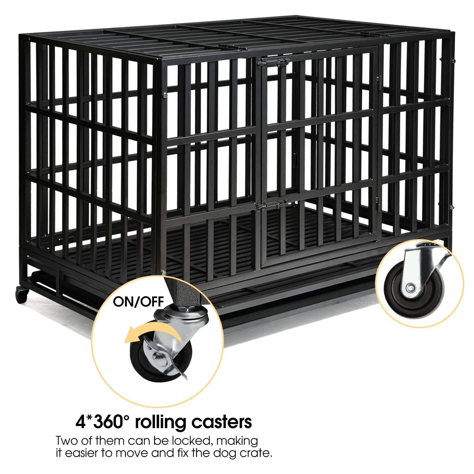 When Should You Use a Dog Crate? If your dog needs a retreat of its own to rest and relax. If your dog tends to destroy your home when you’re away. If your dog has high separation anxiety and needs a place to feel safe. Why Choose this Heavy-Duty Dog Crate? Quality Materials: Made up with upgraded steel, it’s indestructible and durable. Super Mobility: Four 360 degrees rolling casters allow you to easily move the kennel around your home. Super Safe: Features four sturdy locks that make the kennel escape-proof. Easy Assembly: Straightforward instructions and numbered parts help you assemble it within 20 mins. Easy to Clean: A pull-out tray and water-resistant veneered surface make cleaning a breeze. Specifications: Color: Black with Hammer-tone Coating Material: Steel Overall Product Size: 47.5”L x 30.7”W x 36”H (121 x 78 x 92 cm) Interior Product Size: 45.8"L x 28.6"W x 28.5"H (117 x 42 x 50 cm) Product Weight: 85 lb (40 kg) Max. Static Load Capacity of the Crate: 300 lb (118 kg) Package Contents: 1 x Dog Crate 4 x Wheels 1 x Instruction Notes: To keep your fur friend safe, always remove its collar before it enters any crate. To choose the right crate size, please measure the size, including length and height, of your fur friend first, and add 4 inches to both final measurements for moving and being comfortable. Please keep an eye on your children and don’t let them climb into or play in or on the product. PREMIUM QUALITY & SAFE FRAME: Our dog crate, made from reinforced corrosion-resistant steel, is hard to be damaged by medium or large dogs. TOP AND FRONT DOOR DESIGN: Double door design allows easier feeding or interaction to your pets. Two firmly slide-bolt latch locks are helpful to keep your dog safely inside their pet home and to avoid the most aggressive canines from escaping. EASY-CLEAN REMOVABLE PAN: Features a removable tray to make cleaning up easily. It allows for any soiling to drop to the pan to maintain a clean environment for dogs. And the dog kennel can easily slide out for easy and convenient cleaning. LOCKABLE &MOBILITY: The four quality wheels are for easy transfer from inside to outside. Two wheels can be locked to prevent accidental movement and keep your dog crate securely in place. EASY TO INSTALL: The dog kennel versatile design allows for extremely easy set up. It only takes less than 10 minutes because majority of the parts are already preassembled. Overall dimension is 48"L X 30.0"W X 35"H