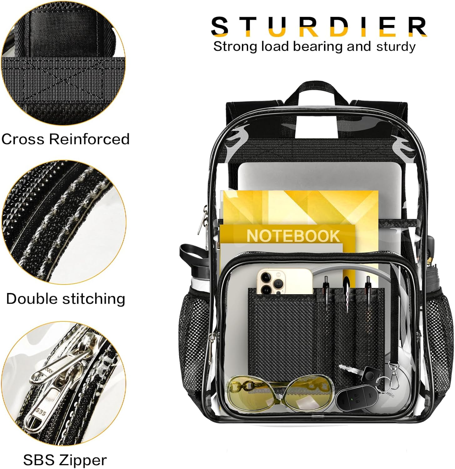 Store New Arrivals Add to Favorite View Feedback Contact Clear Backpack Heavy Duty Large Transparent Backpack with Reinforced Bottom Multi-Pockets for College, Travel, Workplace Security - Black Description Age Range Description Adult Capacity Total 27.52 Liters Number Of Items 1 Color Black Product Dimensions 7.9 x 12.6 x 17 inches Country of Origin China Item Weight 1.9 pounds Department unisex-adult Units 1 Count 【Large Capacity】Dimensions:12.6 x 7.9 x 17 inches, this heavy duty clear backpack can hold every thing you need for college and work. 1 large main compartment for binders, laptop,1 inner zipper pocket for phone, wallet and etc , 1 front zipper pocket with 2 mesh pockets, 3 pen pockets and 1 key chain. 2 side mesh pouches for water bottles or folding umbrellas. 【Ergonomic Design】With two S-shaped widened padded adjustable shoulder straps and designed with chest clip, it doesn’t slip down and can reduce the pressure on your shoulders, comfortable to use. Reinforced with double cross stitches to prevent tearing and long-lasting, each strap has a reflective tape for safety at night. 【Premium Materials and Workmanship】Double reinforced stitches with nylon thread, our heavy duty backpack have better carrying capacity compared to other backpacks on market, equipped with higher quality SBS zippers for smooth sliding.The mesh pockets on both sides are made of thickened materials to prevent tearing and the bottom oxford cloth is sturdy and scratch-resistant. 【Thicker PVC Material】Our clear backpack are made of 0.5mm thick PVC material, sturdy enough for everyday use, It is cold resistant without cracking and can maintain its shape when empty or full. 【Applicable Occasions】The see-through design is convenient for safety inspection, which can quickly pass through checkpoints and save time. Suitable for colleges, workplaces and travel. It is a unisex ideal gift for your family and friends. Product Description ABOUT US We offer the best prices around on high quality products. Our E-store includes media such as books, movies, music and games while offering electronics, toys, sporting apparel, clothing, tools, general home, garden items and more. SHIPPING We are always working hard to ensure your package arrives as soon as possible. Please understand that some factors like weather, high postal traffic, and the performance of shipping companies are outside of our control. We offer free shipping to the lower 48 states and ship within 2 business days of payment, usually sooner. We do not accept P.O. Boxes. Please provide a physical address. For shipping outside of the continental USA, we only use eBay's Global Shipping Program.The item is shipped to KY and then sent to the rest of the world. International customers are responsible for all duties and taxes. Continue to check out in order to calculate costs for shipping the item to your country. Messages regarding eBay's Global Shipping Program MUST be directed at eBay EXCLUSIVELY. RETURNS We offer a 30-Day Return Policy on items which you are not completely satisfied with. You have the option for a full-refund or an exchange of the item. No returns are available on items shipped outside of the USA. PAYMENT We accept PayPal. CONTACT US This page content is yet to come Please ad us to your favorite seller and visit again later Thank You CUSTOMER SATISFACTION We try our very best to make sure every customer is completely satisfied. If there's a problem, message us! We're happy to help. WE ACCEPT Copyright © 2021 AutoDS. | All Rights Reserved