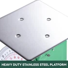 About this item 【Robust Construction】This mechanical food scale has a rust resistant, heavy duty steel body and shatter-proof lens, designed to withstand tough conditions. 【Sturdy Stainless Steel Platform】Due to its make and design, this mechanical portion control scale is easy to clean between uses. The heavy-duty, large capacity flat top surface allows for placement of big items. 【Easy to Read】Our industrial scale has an angled dial and larger numbers for better reading accuracy. Wide open face allows for easy to read measurements between kilograms and pounds. ( kg / lb ) 【Ideal for Indoors & Outdoors】This heavy duty mechanical scale is suitable for the delicatessen, restaurant, supermarket, grocery store, pub or concession stand. It can serve as a receiving scale for the food industry, a measuring scale for delivery companies, as well as weighing farmhouse items such as grain, feed, meat or produce. Can also be used to weigh packages and luggage. 【Capacity】The mechanical portion scale can weigh up to 110 lb in 8 oz increments or 50 kg in 200 g increments. 【For First Time Setup】Please see the product description below for the step by step instruction on setting up and calibrating the scale. Brand: Display Type: analog Weight Limit: 110. 23 Pounds Form Factor: Flat Material: Stainless Steel