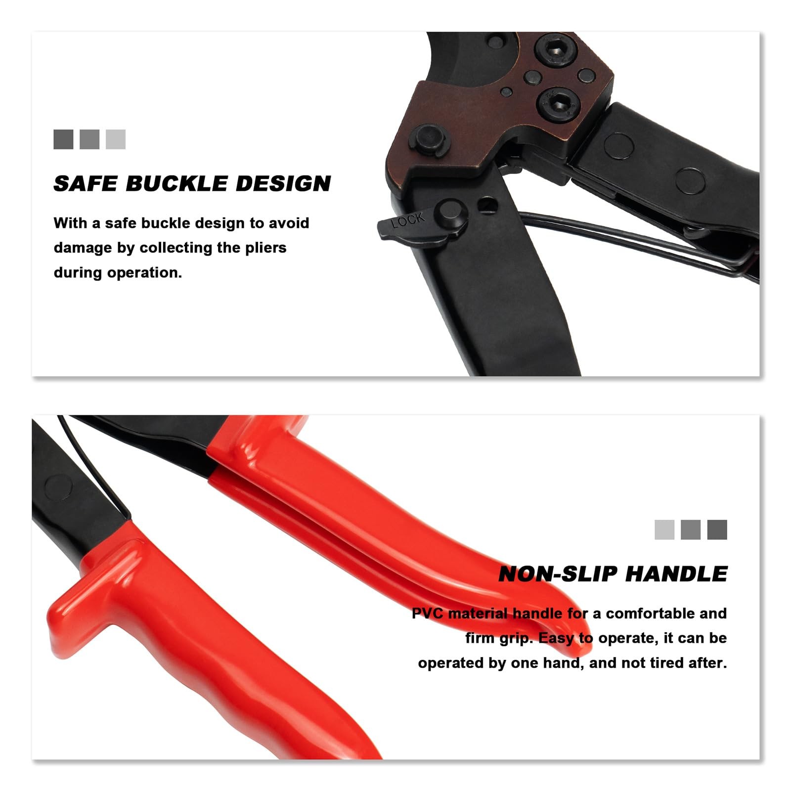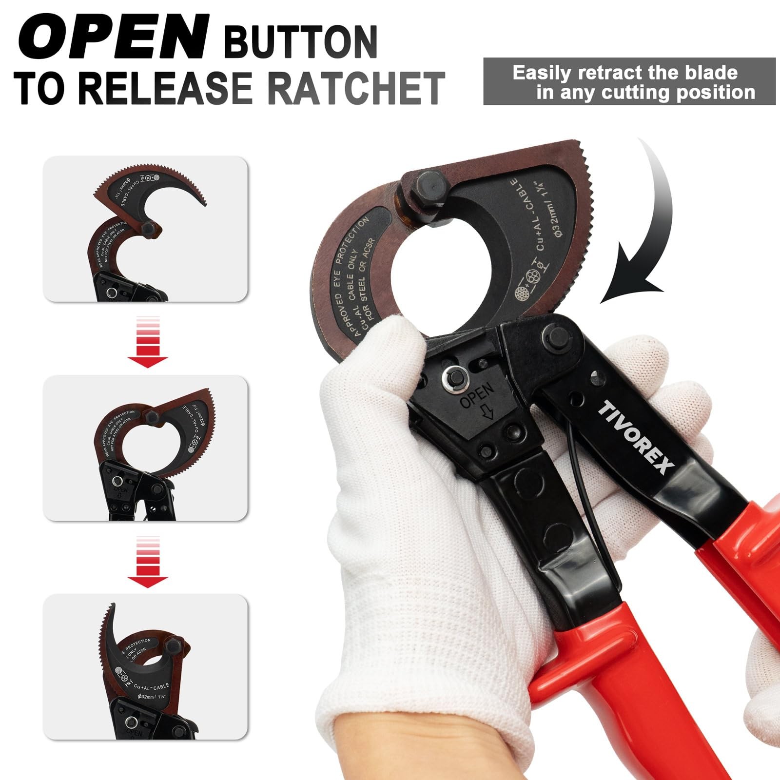 H325B-TX Ratcheting Cable Cutter Hand Tool The ratcheting cable cutter can easily cut copper or aluminum cables. Features anti-slip rubber hand guards that offer a secure grip. Package Include: 1× H325B-TX Ratchet Cable Cutter Specifications: Length: 25cm/9.8in Weight: 0.65kg Color: Red + Black Cutting Range: up to 240mm² Application Scope: 300MCM copper cable; 600MCM aluminum cable Warm tips: can not be used to cut steel, steel wire, and electrified wire 【Efficient Ratchet Design】:The heavy-duty ratcheting cable cutters adopt a ratchet drive device, enabling swift and precise cuts with little labor. Experience efficient and precise cutting. 【Exceptional Craftsmanship】:Made of #56 manganese steel, forged, oil-hardened treated for greater hardness, strength, and resistance to deformation and rust. 【Impressive Cutting Capacity】:Ratchet cutters cut copper cable up to 300 MCM, aluminum cable up to 600 MCM, cutting range is about 240mm². Not for cutting steel, armored, steel wire, live wire or ACSR. 【Safety & Convenience】:The cable cutters fearture a security lock on the handle, simply lock it when not in use to avoid damage by collecting the pliers during operation. 【Easy Operation】:Press the "OPEN" button and adjust the knife, then put the cable into the center of the cutter edge and press the handle repeatedly to complete the cutting.