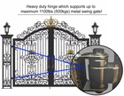 The sold on to gate roller hinge is designed for the metal swing gates. It is maintenance free - you'll never have to grease them! The super strong hinges are adjustable for perfect installations and offer near frictionless movement. It's ideal for estate, commercial, industrial, ornamental iron and access controlled gates. The slotted yoke is for on site adjustment! HEAVY DUTY INDUSTRIAL- The gate hinge is made of high quality steel so that each pair of the hinge can hold up to 1100lbs driveways and swing gates! ADJUSTABLE - The distance between the gate post and the gate can be adjusted horizontally for perfect installations! EASY TO INSTALL - Weld the flat backing plate to the mounting post and the rotating part to the gate! It's ideal for both flat and round post! TOUGH & DURABLE - Highest weight ratings, tested to over 1 Million open/close cycles! MAINTENANCE FREE - The hinges contain high-temperature sealed bearings, safe to -coat after installation: No greasing - no maintenance.