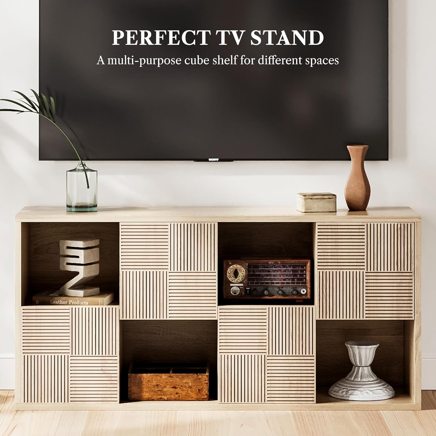 Product Description About this item Cube Storage Organizer with 4 Doors: Compared with ordinary display cabinets on the market, our cube organizer has 4 more carved doors, which meet the storage needs and protect your privacy and aesthetics Mult-functional: Dimension of 11.8"D x 23.6" W x 49.2"H allows it to be an 8-cube storage bookcase or a TV cabinet, which can hold up to 55 inches of TV. This cube storage shelf fits standard 11" bins perfectly Placement methods: vertical, horizontal, or combined placement. Create storage and display space for any living area in your home for books, garments, décor, picture frames, or keepsakes. Ideal for the trendy organization with back panels High-Quality Material: Crafted from E1 premium chipboard, no need to worry about the generation of harmful gases, and the sturdy structure is sufficient to support daily storage needs, providing an excellent storage organizer for your family Easy Assembly: With detailed and user-friendly instructions, along with all the necessary tools included, enjoy a smooth assembly process of the bookcase Previous page Next page Multi-scenario Application
