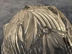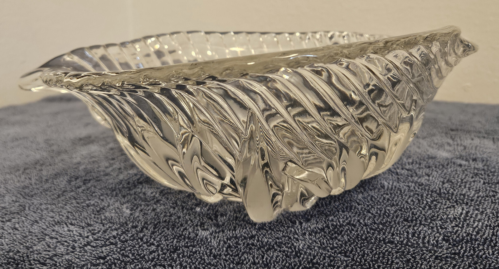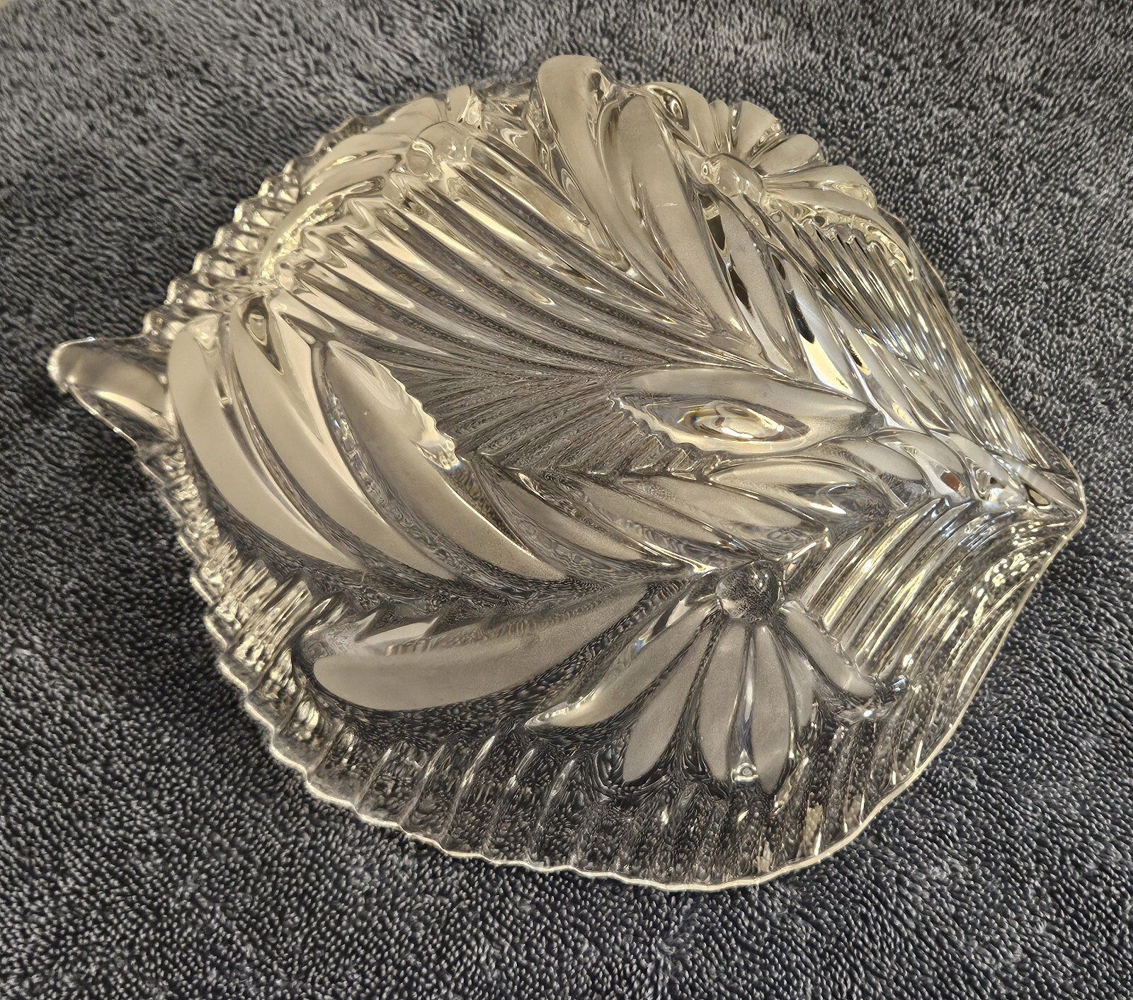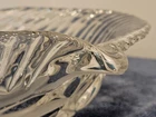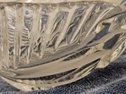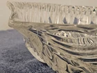 This product is a heavy lead crystal footed salad bowl with a frosted lily design. It features an irregular shape and a contemporary style, making it a decorative and functional piece for serving salads or other dishes. The clear color and floral pattern add a touch of elegance to any dining table, while the pressed glass production style ensures durability and quality. This unmarked salad bowl is a unique and stylish addition to any collection of pottery and glass items.