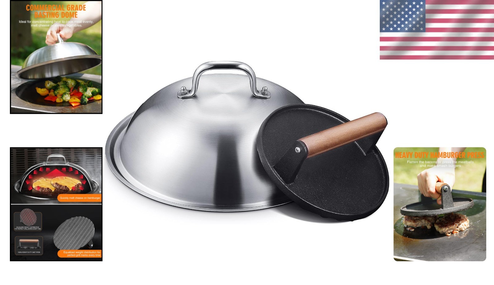 Heavy-Duty 12.5-Inch Melting Dome & 7-Inch Burger Press for Blackstone Griddles ‹ › ‹ › ‹ › ‹ › ‹ › ‹ › ‹ › Heavy-Duty 12.5-Inch Melting Dome & 7-Inch Burger Press for Blackstone Griddles 🔥 Commercial Grade Accessories for Blackstone - Elevate your grilling experience with our professional chef-level flat top grill accessories designed specifically for Blackstone griddles. Found in restaurant kitchens, these tools ensure you can create gourmet dishes right at home. 🔥 Top Quality And Superior Material - Crafted from 2.5mm thick 304 stainless steel, the basting cover is not just heavy-duty but also easy to clean. The accompanying cast iron burger press features a sturdy wooden handle, promising durability and comfort. 🔥 Large Diameter - With a generous diameter of 12.5 inches, the griddle steamer dome covers multiple hamburger patties and an array of vegetables, enhancing your cooking efficiency. The 7-inch diameter round shape of the cast iron burger press is ideal for perfectly shaping burgers, bacon, chops, and steaks. 🔥 Cook Evenly - The griddle melting dome excels at concentrating heat, ensuring even cooking, melting cheese, or steaming vegetables to perfection. Meanwhile, season the cast iron burger press to create a natural non-stick surface. 🔥 2 Griddle Tools Set - Enjoy a comprehensive grilling experience with this essential set, which includes one Griddle Basting Dome and one Griddle Weight—perfect for chefs of all levels. Ideal for preparing bacon, beef, burgers, poultry, flatbreads, grilled sandwiches, quesadillas, paninis, and more during cookouts, barbecues, tailgating, or camping trips. Grilling Meets Perfection Unleash your inner grill master and create unforgettable moments with family and friends. Invest in these premium accessories today and experience the true essence of outdoor cooking excellence! Shipping Free & Fast Shipping - We offer free shipping to most of the USA with a normal delivery time of 3-10 businessdays. However, due to various situations, additional delivery time (up to 3 weeks) may be required for some items. Alternative Carriers - We may use alternative carriers (e.g. USPS, FedEx, UPS, etc.) to ensure your package arrives safely and on time. Due to the use of multiple carriers, we are unable to provide a tracking number automatically. Handling Time - Orders are processed and shipped within 1-5 business days of receiving cleared payment. Shipping Restrictions - Shipping to Alaska, Hawaii, Puerto Rico, Guam, and other US territories may incur shipping charges or delivery restrictions. Please contact us before ordering, or your order can be refunded/cancelled. State Restrictions - There may be restrictions based on your state of purchase. For example, certain items may not be shipped to California due to state regulations. Contact for Tracking Updates - If you require tracking updates or have any concerns about the delivery of your order, please feel free to contact us, and we will be happy to assist you. Return Please see our ebay return policy. We do not accept return on most products. This is to avoid customers mis-using ebay returns. All sales are final. Please be sure to check the return policy listed at the top of the listing. In rare cases, we may accept returns, if the buyer pays both ways shipping and 20% restocking fee. If you are un-sure of return policy of a particular item, please ask before buying. Payment We accept all major credit cards, PayPal, and Apple Pay for your convenience. Your payment information is secure and encrypted to ensure a safe and seamless transaction. Please complete your payment within 3 days of purchase to avoid any delays in shipping. Feedback Your feedback is extremely important to us. We strive to provide the best products and customer service possible. If you are satisfied with your purchase, please take a moment to leave us a positive review. If you have any concerns or issues with your order, please contact us before leaving negative feedback. We are committed to resolving any problems and ensuring your satisfaction. Contact Us If you have any questions or concerns, please feel free to reach out to our customer support team. You can contact us through the eBay messaging system. We are available Monday to Friday, 9:00 am to 5:00 pm EST, and we will do our best to respond to your inquiry within 24 hours. Buy it now and enjoy a pleasant shopping experience! UPC: Not Set Unit Quantity: 3.27 lb Set Includes: Griddle Basting Dome,Griddle Weight Features: Easy Clean,Durable,Heavy Duty,Easy to Clean,Professional Chef Level,Non-Stick Surface,Seasonable,Even Cooking Type: Griddle Tools Set Brand: Unbranded Color: Silver Number in Pack: 2 Handle Material: Wood Size: Large Head Material: Cast Iron Finish: Polished Item Weight: 3.27 lb Country/Region of Manufacture: Not Set Item Height: 5 in Item Width: 7 in Year Manufactured: Not Set Number of Items in Set: Two-Piece Model: Not Set Style: Modern MPN: Not Set Manufacturer Warranty: Not Set Unit Type: lb Personalize: Not Set