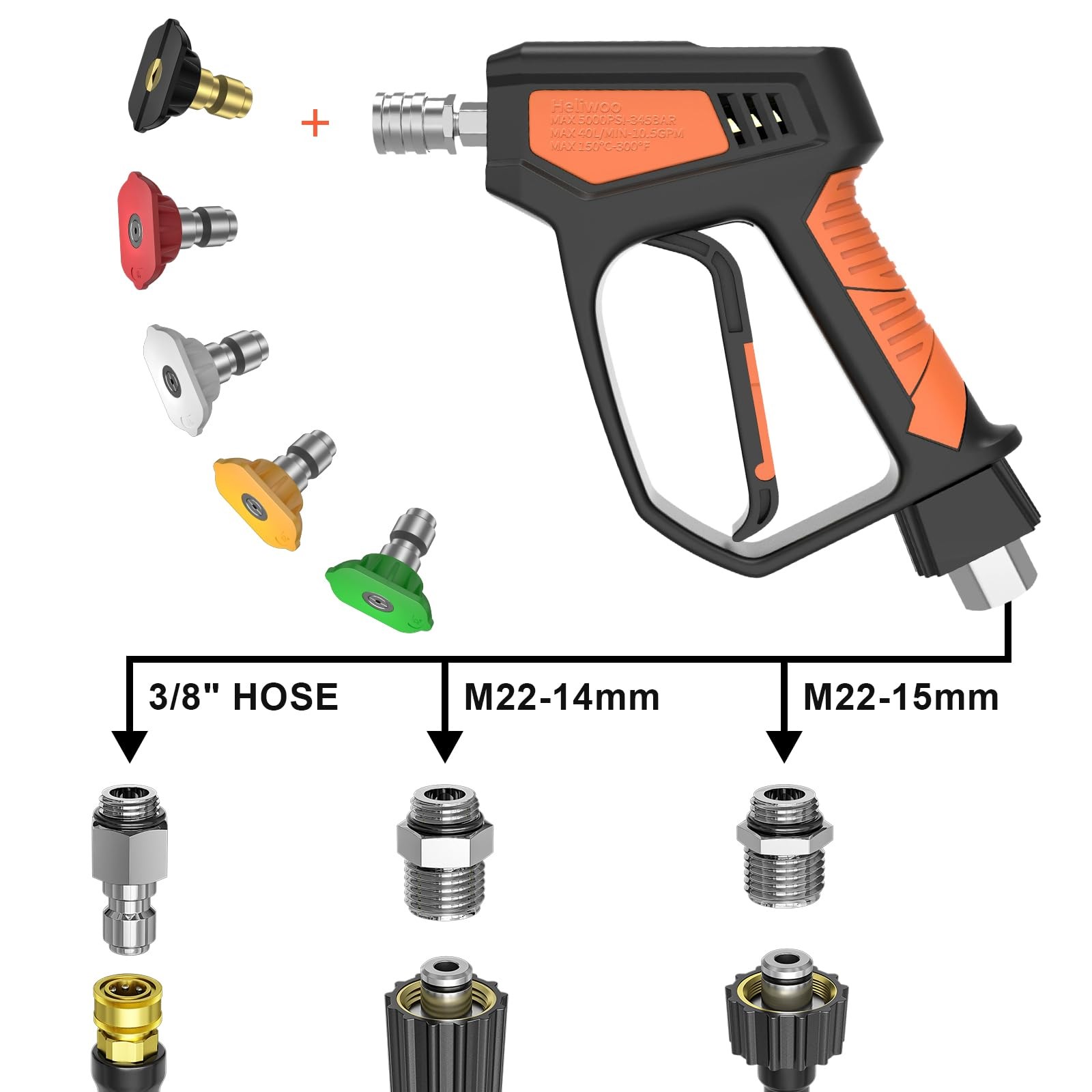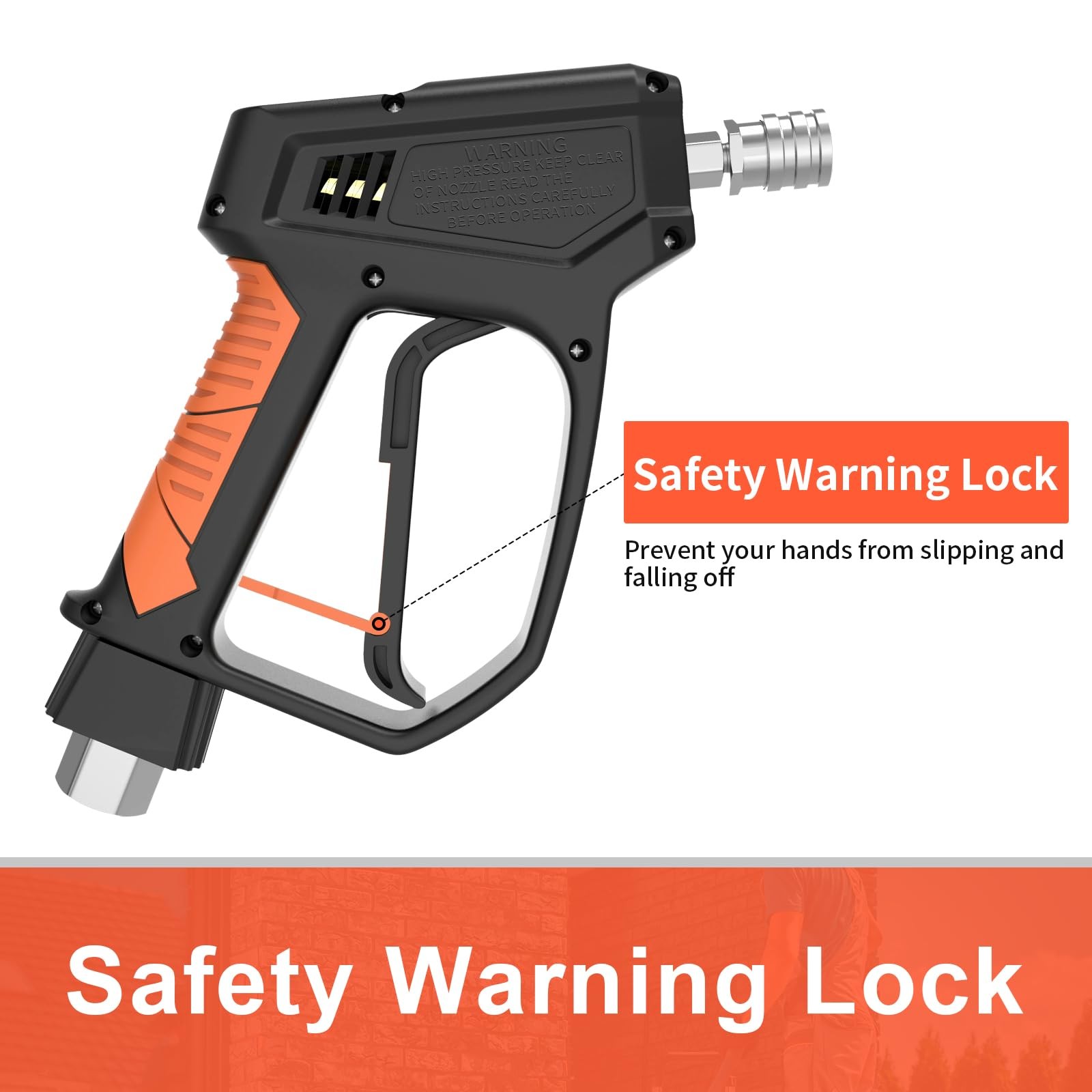pressure washer gun Pressure washer gun × 1, Pressure washer nozzle × 5, 3/8 quick connect × 1, M22-14mm fitting × 1, M22-15mm fitting × 1 Meeting different needs and multiple cleaning methods, such as car washing, surface drains, windows, roofs, gutters, floors and more. 【5000 PSI pressure washer gun】Max. flow 10.5GPM and temperature Max.150℃ ( 300℉). Stainless steel 3/8 quick coupling, Equipped with M22-14 and M22-15 mm fittings to connect the high pressure washer hose. 0.75 kg weight allows it to balance more pressure. 【360 Degree swivel design】The power washer gun is equipped with a rotary water inlet for free rotation during use, preventing kinks and entanglement on the hose. 【Long-lasting】The pressure washer gun can work properly under pressure up to 5000 PSI. High-quality solid brass and stainless components for maximum strength to ensure built last. It will not leak over hundreds of uses. The pressure washer spray gun is equipped with a safety trigger lock that prevents accidents during cleaning. 【Convenient & efficient】Designed for pressure washers, suitable for domestic, commercial and industrial high pressure washers. Gifted with 5 different nozzle tips:0°, 15°, 25°, 40°, 65°. The pressure washer gun is suitable for a variety of cleaning occasions, such as car washing, ground gutters, windows, roofs, gutters, floors, etc. 【Package include】Pressure washer gun × 1, Pressure washer nozzle × 5, 3/8" male NPT plug × 1, M22-14mm adapter × 1, M22-15mm coupler × 1 【After sale service】If you have any product-related questions,please feel free to connect at any time, we will provide you some solutions.