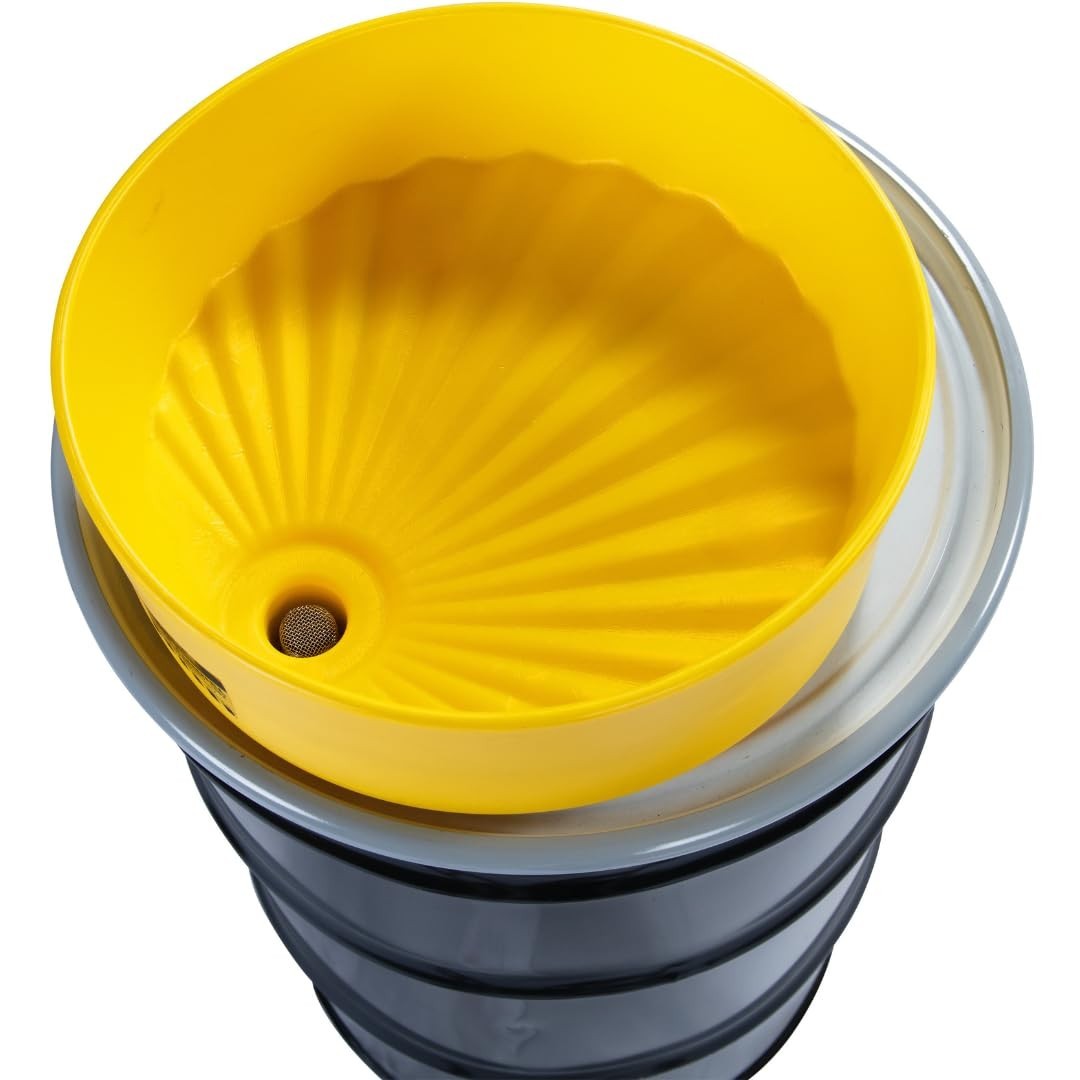 Material Plastic Brand Eagle Color Yellow Capacity 30 Gallons Product Dimensions 18"W x 7"H Drum funnel with brass screen 18" Wide drum funnel fits both 55 and 30 gallon drums 6" High side walls reduce spashing and spout fits any 2" NPT sprung Measures 18" diameter by 7" height