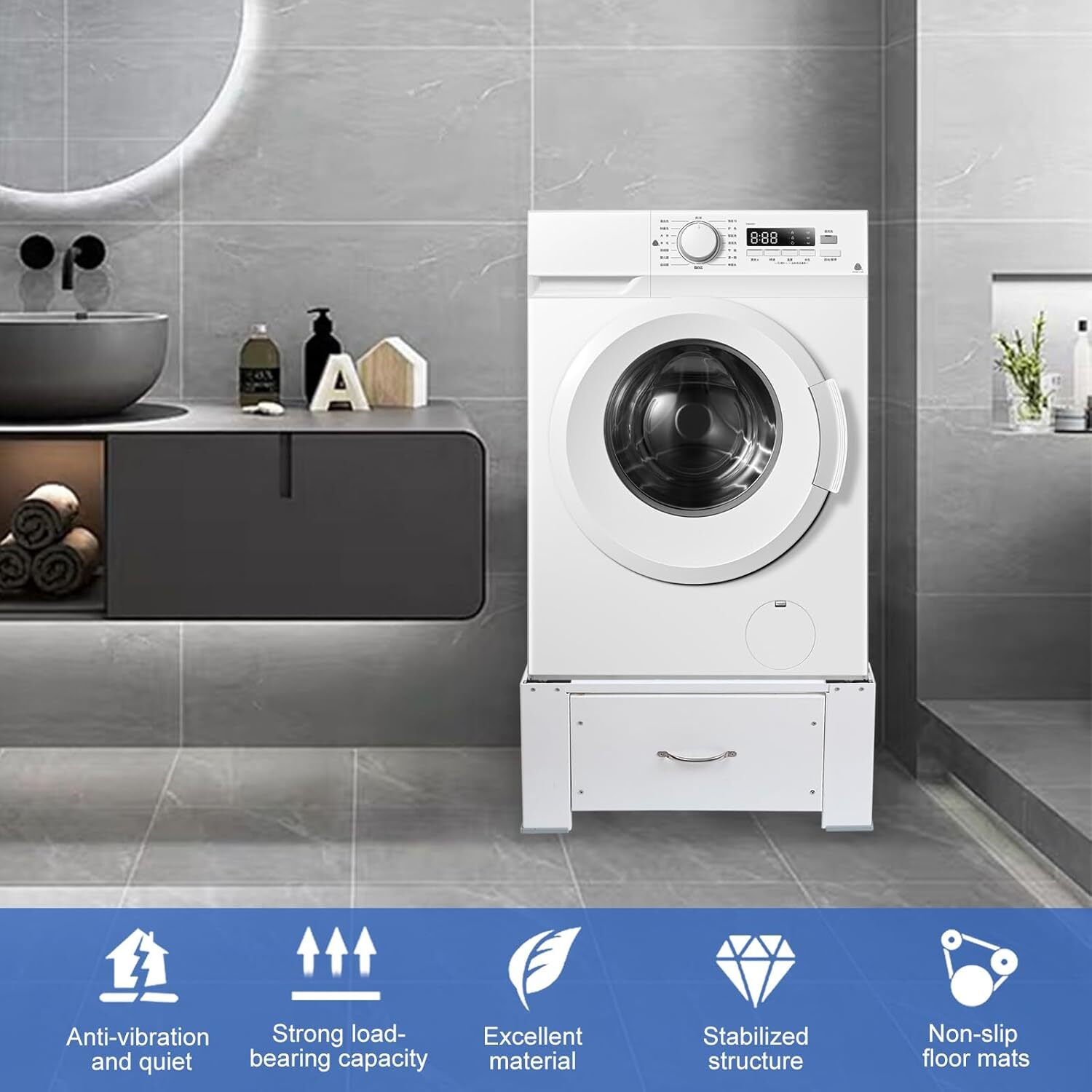 Heavy-Duty Steel Washing Machine Pedestal with Storage Drawer, Laundry Pedestal Washer and Dryer Stand Platform Universal Fit 330lbs Capacity, Metal Washing Machine Base Stand for Dryer Base Platform 【Sturdy and Durable】Our washer pedestal is thoughtfully designed and crafted using heavy-duty, high-quality carbon steel. The widened legs enhance stability, capable of supporting weights of up to 330 pounds, eliminating any wobbling and ensuring your washer and dryer are securely and firmly positioned. 【Additional Storage Space (Drawer Version)】The drawer model features a drawer, perfect for storing moisture-sensitive items while also acting as a dust shield, making your space appear neater. 【ANTI-SLIP & ANTI-SHOCK】Our washer and dryer riser is equipped with shock-absorbing mats and anti-slip feet, ensuring your washer or dryer stays securely in place while lessen shocks and noise. 【Ease of Use】This Heavy-Duty Washing Machine Pedestal with Drawer raises your washing machine or dryer by 12.8", making loading and unloading easier with less bending, the pedestal can comfortably and safely hold your washing machine or dryer with a weight capacity of 330 lb. 【EFFORTLESS INSTALLATION】 Setting up your washer and dryer stand is a breeze, taking less than 20 minutes. No complex instructions or tools required—enjoy a quick and straightforward installation process. Shipping We offer FREE shipping on all orders! We ship within Three business days of payment, usually sooner. Local pickups and combined shipping options are not provided at this time. Return You can return a product for up to 30 days from the date you purchased it. Any product you return must be in the same condition you received it and in the original packaging. Please keep the receipt. Payment We accept payment by any of the following methods: PayPal Please pay as soon as possible after winning an auction, as that will allow us to post your item to you sooner! Feedback Customer satisfaction is very important to us. If you have any problem with your order, please contact us and we will do our best to make you satisfied. Contact Us If you have any queries, please contact us via ebay. We usually respond within 24 hours on weekdays. Please visit our eBay store to check out other items for sale! Thank you for shopping at our store.