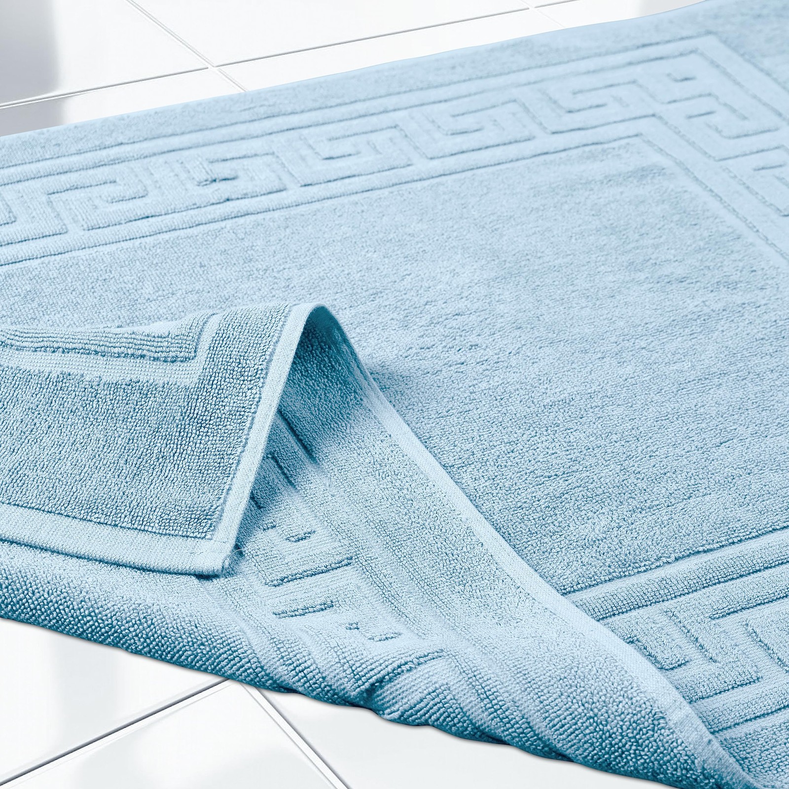 MAXIMUM ABSORBENCY: Made from 100% Cotton, this bathroom rug set offers absorbency compared to thinner bath mats; enjoy cloud-like comfort when you step out of your shower or bath; Choose from 15 gorgeous colors TWO-PIECE SET: Enjoy the convenience of this two-piece bath rug set, measuring 22" x 35" each, to outfit both your main and guest bathroom; transform your bathroom to a mini spa with this stylish duo; perfect for shared, large, or multiple bathrooms ELEGANT DESIGN: The traditional Greek key design will add an elegant touch to your bathroom decor and coordinate beautifully with your existing decor; Enjoy hotel luxury in the comfort of your home with these soft spa and hotel quality bath mats CARE INSTRUCTIONS: Easy to care for, simply toss these bath mats in the washing machine and tumble dry on low or air dry whenever needed; Always follow care label instructions for best results EXCELLENT GIFT: Our designs match a variety of styles and make great gifts; perfect for friends and family; we're committed to make products safer for you and safer for the world; this product is OEKO-TEX certified for safety and sustainability