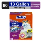 Trust Hefty Ultra Strong 13 Gallon Trash Bags to keep your kitchen waste contained—all the way from the can to the curb. Thanks to 6-in-1 Protection, these tall kitchen trash bags offer flexible strength, a secure closure, patented odor control, and resistance to leaks, punctures, and rips. The result is the highest protection you can get in flexible 13 gal trash bags. Hefty’s stretchy strength means you don't have to worry about unexpected bag breakage and inconvenient messes when you use these tall kitchen garbage bags. A break-resistant grip drawstring makes it easy to close the bag and cart it away without incident. As a bonus, these scented garbage bags 13 gallon size include patented Arm and Hammer continuous odor control and a Fabuloso scent to keep unpleasant smells at bay and keep your kitchen smelling fresh and clean. All Hefty trash bags are backed by a 100% satisfaction guarantee. *Fabuloso (R) and associated designs are trademarks of Colgate-Palmolive Company and are used under license. **The ARM and HAMMER trademark is owned by Church and Dwight Co., Inc., and used by Reynolds Consumer Products LLC under license. 13 Gallon Tall Kitchen Garbage Bags—This package contains 80 Hefty Ultra Strong 13 Gallon Kitchen Trash Bags in White, Fabuloso scent Toughness You Can Trust—Hefty’s strongest tall kitchen garbage bags deliver toughness you can trust with superior durability Arm and Hammer Odor Control and Fabuloso Scent—Patented odor control with scent of Fabuloso, leverages the power of Arm and Hammer to fight odors 6-in-1 Protection—Hefty 13 gallon trash bags offer 6 features: flex strength, tough drawstring, odor control, resistance to leaks, punctures, and rips 100% Satisfaction Guarantee—We want you to be happy with your tall trash bags 13 gallon size; if you have any issues, please contact us Features Scented, Puncture Resistant Volume Capacity 13 gal Bag Closure Drawstring Scent Fabuloso Recommended Use Residential, Commercial Recommended Room Kitchen Brand Hefty Manufacturer Part Number 00E88 Color WHITE Manufacturer REYNOLDS CONSUMER PRODUCTS INC. Assembled Product Dimensions (L x W x H) 4.13 x 8.25 x 9.50 Inches