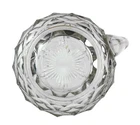 This pitcher is large and in charge! It's 7 inches tall at the middle of the top, and holds at least a gallon. It weighs 5 lb 3 oz all by itself. It looks, by its shape, the handle style, and the design on the bottom surface, like a Heisey product, but I can find no others like it online. There are a few small chips and scratches at some of the points but overall this pitcher is in beautiful vintage condition. No seams.
