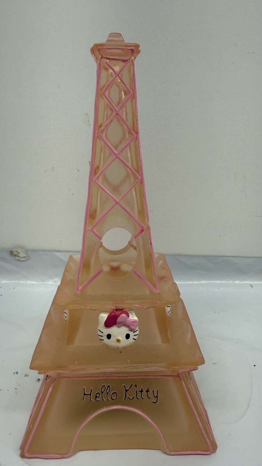 The Hello Kitty In Paris Eiffel Tower Pink Plastic Replica Tooth Brush Holder is a charming collectible featuring the popular Hello Kitty character in a Parisian theme. The tooth brush holder stands at 7 inches tall and is crafted from pink plastic, making it a delightful addition to any Hello Kitty fan's collection. With a nostalgic design from 2009, this item showcases Hello Kitty's iconic style and is a fun reminder of the beloved franchise. Made in China, this unique piece captures the essence of Hello Kitty's adventures in the City of Light.
