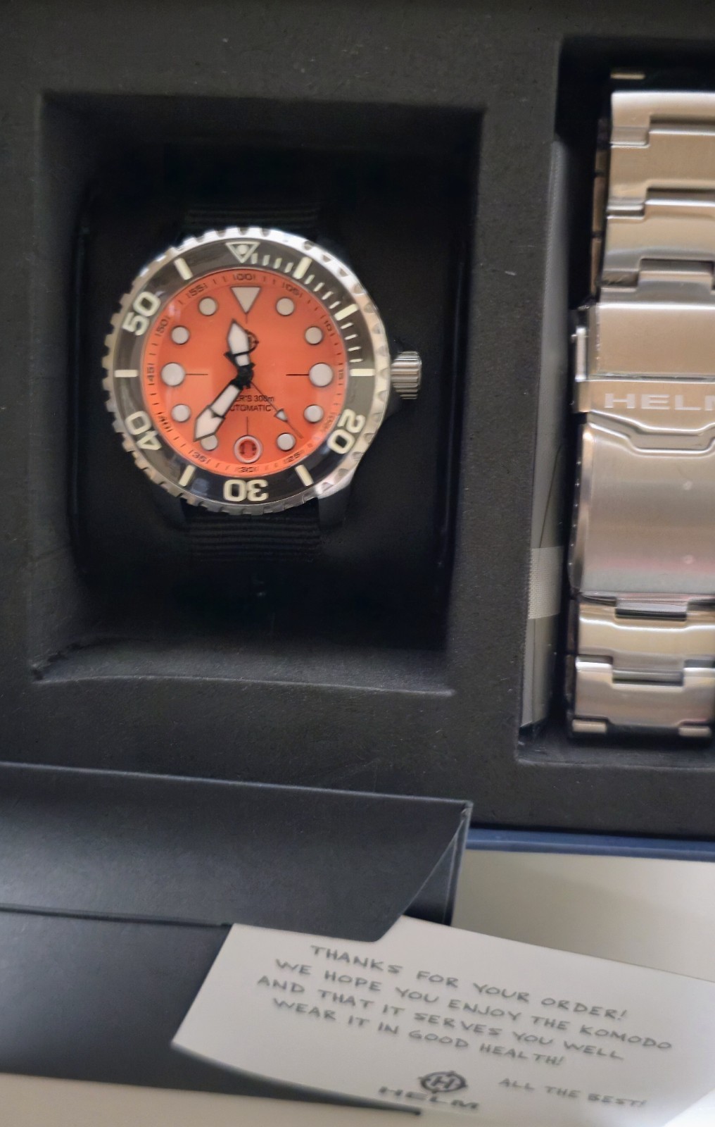 The HELM Komodo features case diameter of 40mm, theISO 6425 compliant. Komodo is the perfect size to strap on for any far-flung adventure: Seiko Instruments NH35 (Automatic Mechanical) Hacking and Manual Winding Functions Accuracy: -20 ~ +40 seconds/day Beats Per Hour: 21,600 24 Jewels Power Reserve: 40 Hours