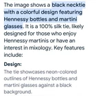 Hennessy Martini Colorful Cocktail Theme Necktie Bright Silk Formal Fun Black Vibrant and colorful Hennessey Martini necktie with cocktail and bottle designs. Perfect for adding a fun touch to any outfit. See the last two photos in the listing for details on the tie. Condition- Excellent- Preloved Color - black background with colorful words and pictures in orange, green, purple, pink, yellow Flat Lay -Measurements approximately: Blade-widest part of the tie-inches- 4 Overall length- inches- 58 Material Content- blend of: 100% silk My items are primarily thrifted and I do my very best to note any imperfections/callouts. Wash to wear - use measurements provided and match to clothes you currently own to determine best size match Ships Next Day Monday - Friday My items are stored in a pet/smoke free home Thanks for stopping in and looking! Lisa