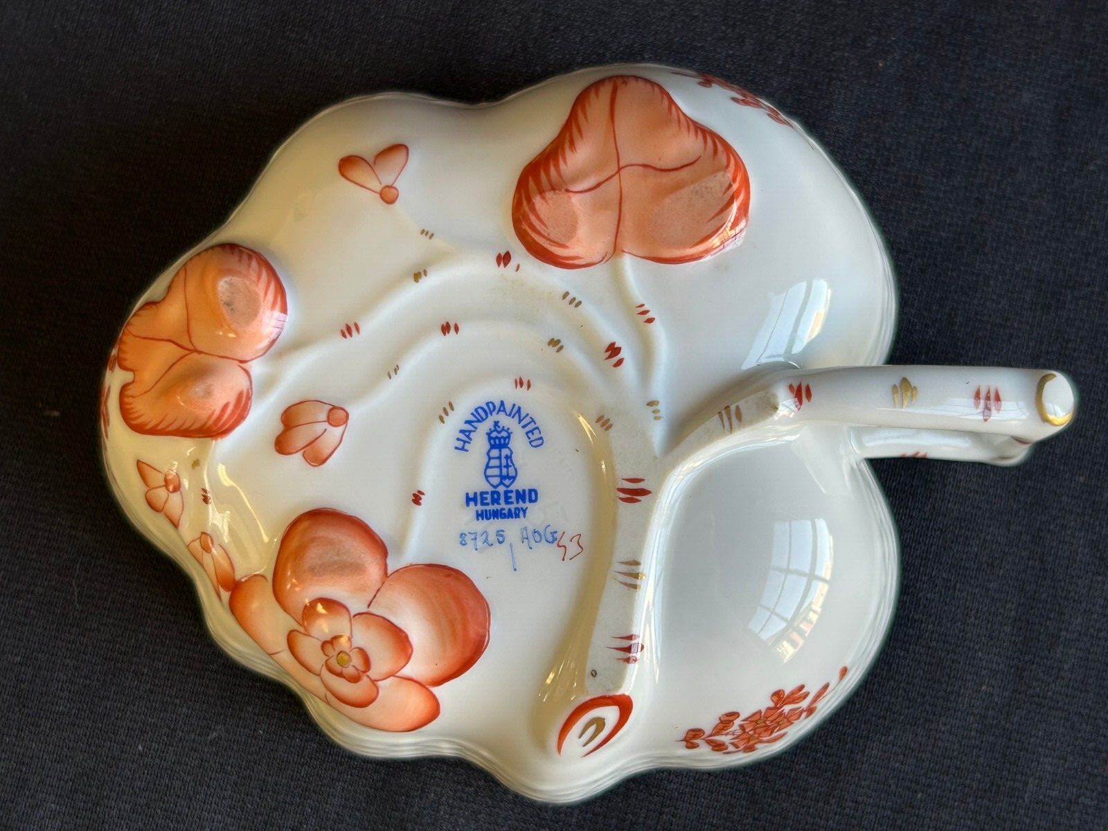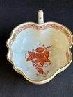 Brick House Antiques of Lewisburg, WV is pleased to offer a Herend Porcelain Lead Dish Small leaf shaped dish with handpainted orange and gold decoration. Basket weave texture on outside rim. Great as a display piece. BUYER PAYS SHIPPING AND HANDLING. WE COMBINE SHIPPING. Local pick up is always welcome!
