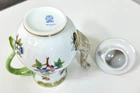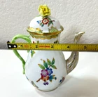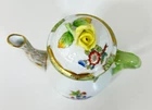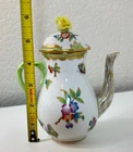 MINT Herend Queen Victoria Hand Painted Porcelain 7" Mini Coffee Pot w Rose Top Specifications: 1614/VBO Approximate Measurements (inches): 6.75" h x 5" w x 3" d Weighs: 8.9 oz Discontinued piece. Made in Hungary. This beautiful little fine porcelain lidded coffee pot w/ hand-painted Queen Victoria pattern & 24K gold elements features the rare branch handle! Pre-loved & in excellent condition! Mint! See photos for close ups & measurements. Ready to ship!