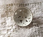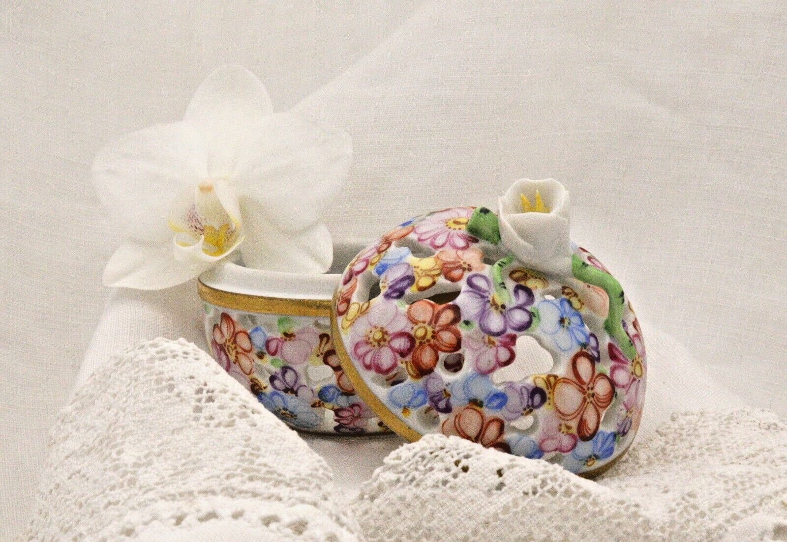 This Herend trinket box is a small round porcelain box featuring a beautiful cut out hand-painted multi-color flower design. The box is adorned with a Lilly finial on the lid, adding a touch of elegance to its Victorian style. Made in Hungary, this collectible piece is part of the Love, Romance collection by Herend and is individually numbered, showcasing its craftsmanship and uniqueness. Perfect for storing small treasures, potpourri, or as a decorative accent, this trinket box combines artistry with functionality in a very charming way. 3" H x 2" W Gorgeous Condition