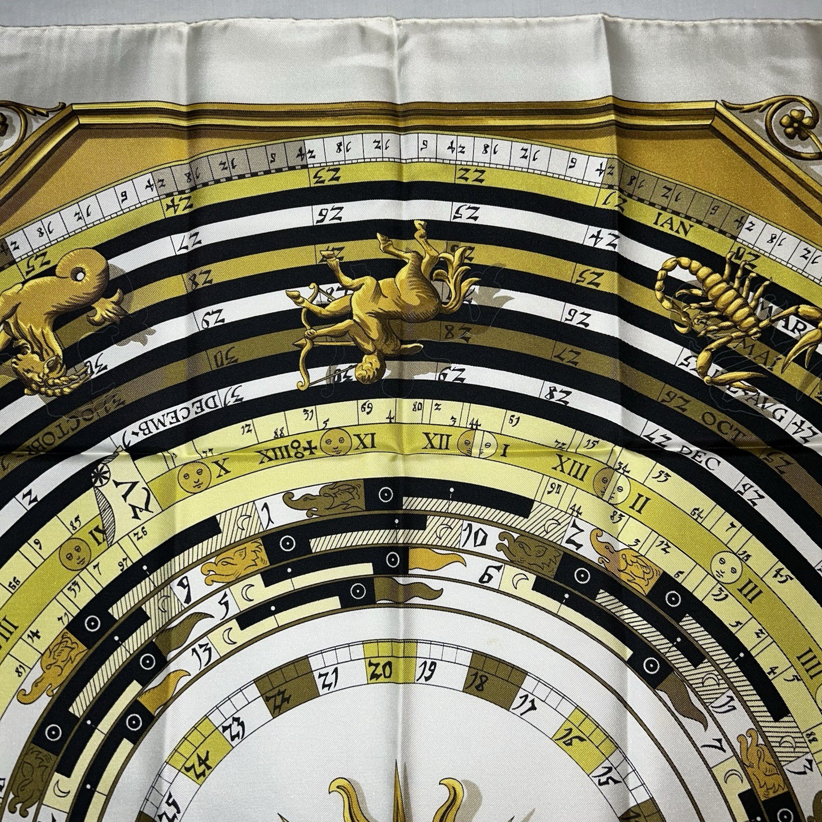 Beautiful Square Hermes 100% silk Model: Astrology Dies And Hore New value: 345 euros 1first edition of 1963 Appoint: Françoise Faconnet Dimensions: H: 88 x L: 90 cm Brand : Hermès Dimensions : H: 88 x L: 90 cm Condition : Very good condition Fabrics : Silk Colors : Golden, Eggshell Year / Collection : 1963