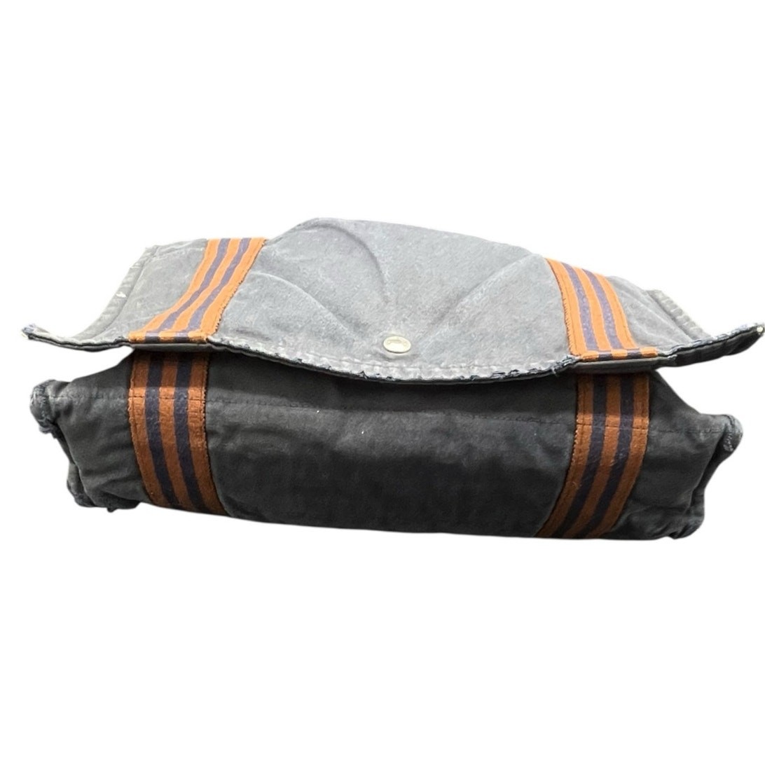 Preowned and Well Worn Hermès Navy Blue Messenger Bag with Orange Striped Handles The bag is still fully functional. The Color is faded Tearing and holes on the corners and edges Please see photos for imperfections. Palladium-Plated Hardware Single Adjustable Shoulder Strap Dual Exterior Pockets Canvas & Single Interior Pocket Flap & Snap Closures at Front Expandable snap allowing adjustable size for main compartment PLEASE look at the photos for wear and TEAR as well as color fading. Estimated Measurements Shoulder Strap Drop: 23" Height: 12" Width: 16" Depth: 3"