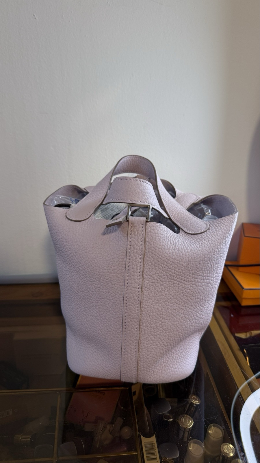 This Hermès Picotin 18 in Pale Pink is absolutely dreamy! The soft mauve shade is so elegant and versatile, making it perfect for any occasion. The Clemence leather feels luxurious, and the palladium hardware adds a chic touch. It’s brand new with the full set—box, dust bag, and receipt—so you know it’s authentic. The size is just right for daily essentials, and the design is timeless. A rare find in pristine condition—definitely a must-have for any Hermès lover!