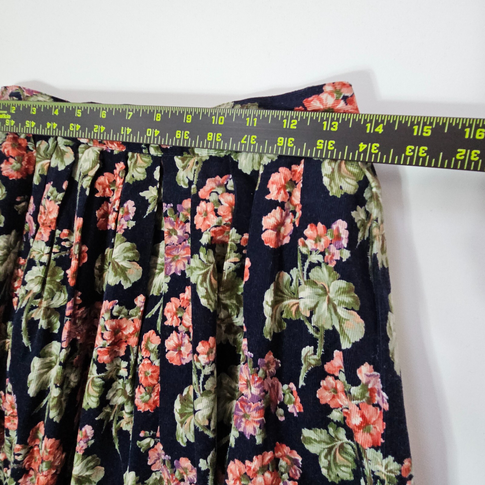 100% cotton classic vintage floral pattern light corduroy pull on with side button closure long below knee length skirt is in excellent clean condition no holes or rips Sz 10 measures flat 13.5" waist 31" length