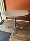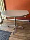 Beautiful Herman Miller Piece with original label. Used but like new. The top is laminated, and has a thermoplastic edge. Steel/Alum base. Very sturdy. The diameter is 36", while the corner part extends to 42.75. Versatile- coffee table, small dining room table, office or small conference table, work station. Does not come with wheels but can be added.