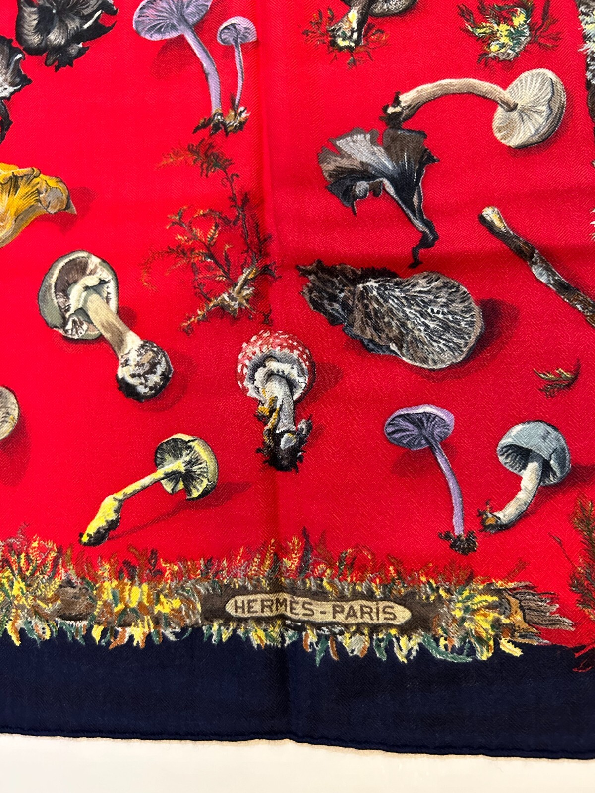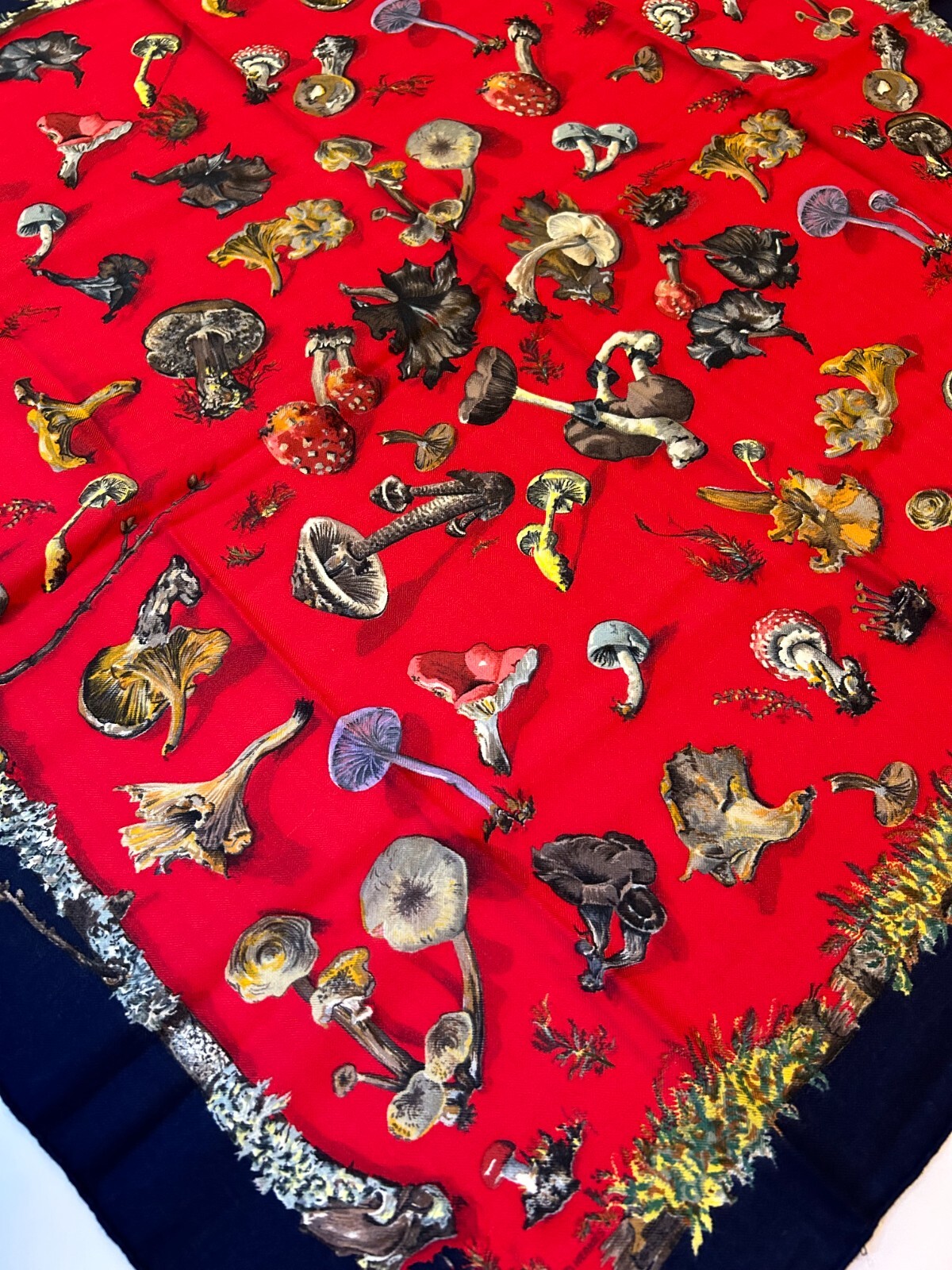 Authentic Hermes Scarf Champignons was designed by Françoise de la Perriere and A. Gavarni. First issued in 1959, reissued in the mid 1980s and more recently in 2005. 90cm Navy x Red color way 65% Cashmere x 35% Silk Made in France Immaculate condition with no issues throughout Vibrant cashmere silk blend with full plump hems and rich vibrancy in the colors.