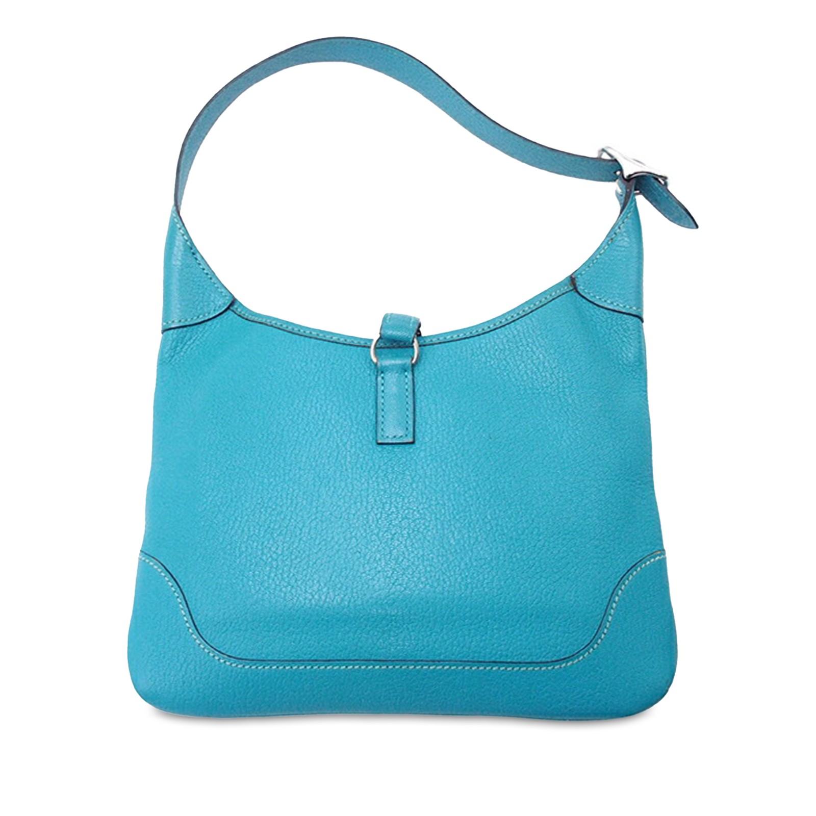 This Hermes Chevre Mysore Trim 24 is a stunning turquoise mini bag with a chic, compact design. The flat shoulder strap and lobster claw closure add functionality, while the interior slip pocket keeps essentials organized. Despite some wear and discoloration, the leather still feels luxurious, making it a great vintage find for Hermes lovers. Perfect for those who appreciate timeless style with a bit of character!