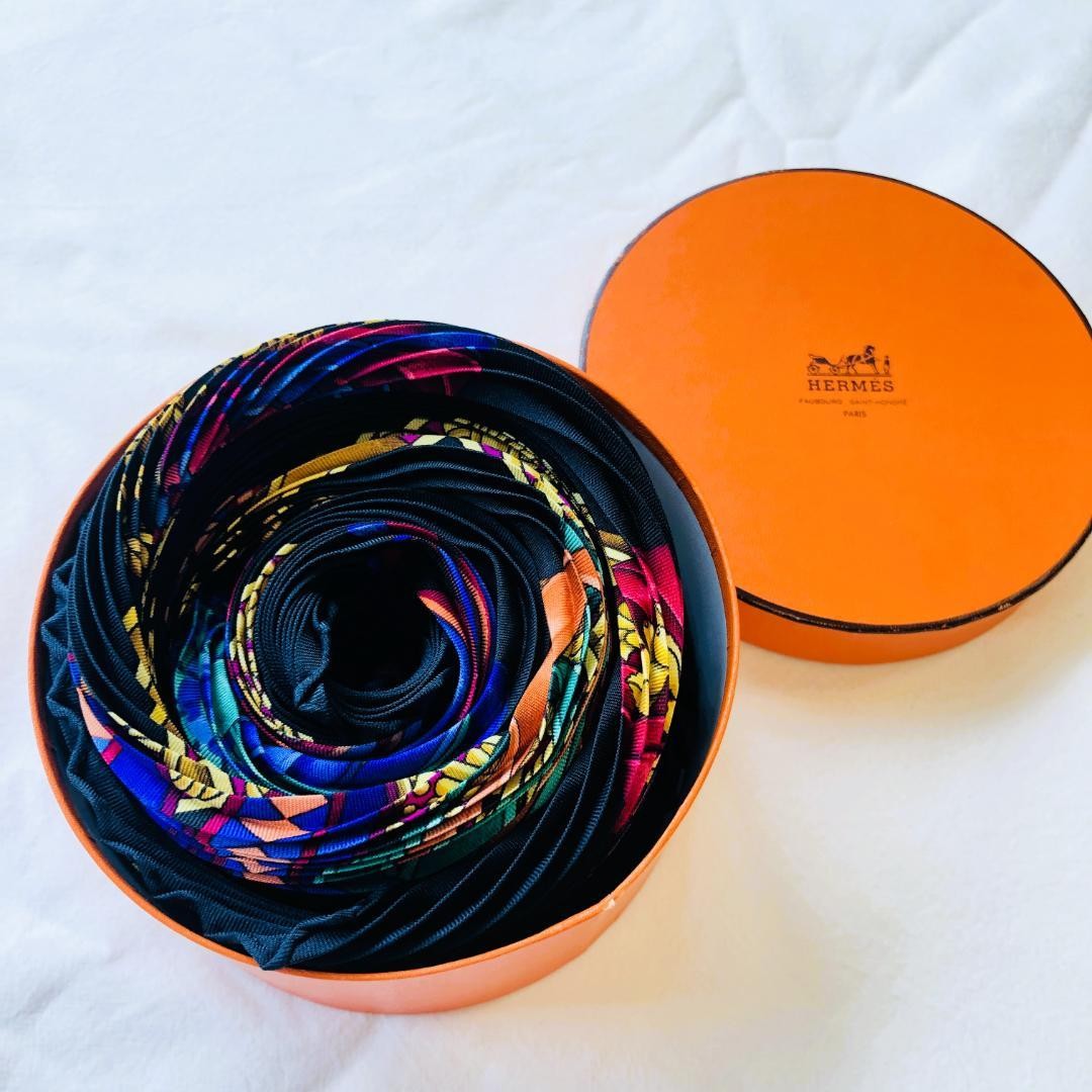 This Hermes scarf is absolutely stunning! The pleated design and horse ribbon detail give it such a luxurious, elegant look. The craftsmanship is impeccable, and the colors are vibrant. It arrived carefully packaged from Japan, and the seller was super responsive. Perfect for adding a chic touch to any outfit—definitely worth every penny!