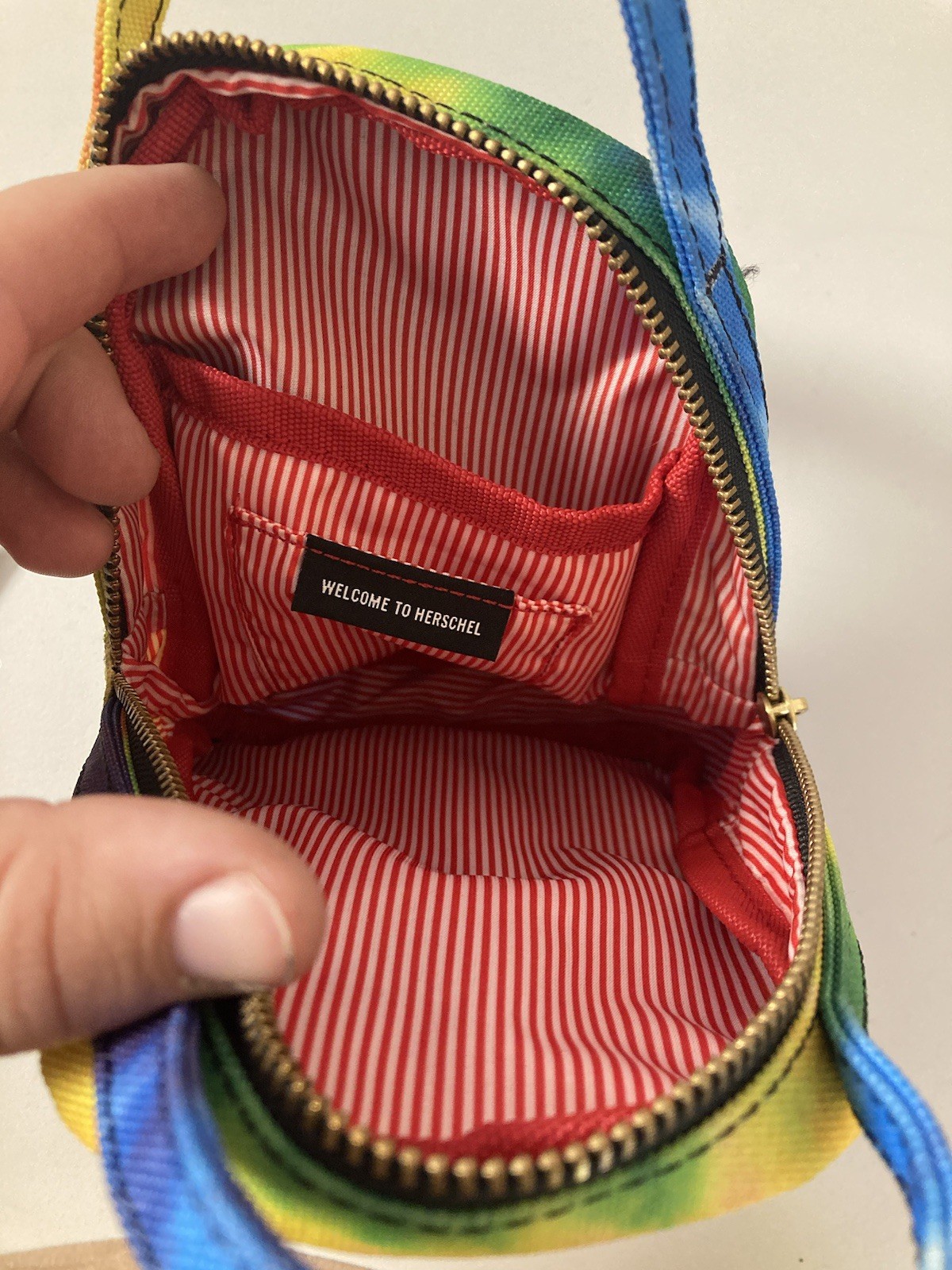 Herschel Supply Co Rainbow Tie Dye Mini Backpack Zip Top Pocket Adjustable Strap There are some marks on the back of the bag that may wash out. I’m almost sure if they will or not. See pictures for details