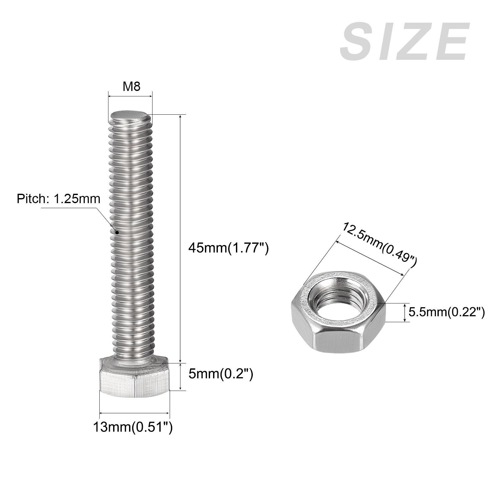 Document APPLY TO - Can be used in house construction and maintenance, machinery assembly, home furniture and appliance, DIY handmade project, etc.SPECIFICATION:Material: 304 Stainless SteelThread Size: M8x45mmThread Pitch: 1.25mmHex Head Size: 13x5mm/0.51"x0.2"(W*T)Nut Size: 12.5x5.5mm/0.49"x0.22"(W*T)Flat Washer Size: 15.5x1.5mm/0.61"x0.06"(OD*T)Lock Washer Size: 12.5x2mm/0.49"x0.08"(OD*T)QUANTITY INCLUDED - 6sets x Bolts, Nuts, Flat & Lock Washers KitsADVANTAGE - Made of 304 stainless steel material which is durable and sturdy. It is anti-rust, anti-corrosion and can be fastened for a long time.Note: Please confirm the size of each component before buying it. Hex Head Screws Bolts, Nuts, Flat & Lock Washers Kits (M8x45mm) 6Sets APPLY TO - Can be used in house construction and maintenance, machinery assembly, home furniture and appliance, DIY handmade project, etc. SPECIFICATION: Material: 304 Stainless Steel Thread Size: M8x45mm Thread Pitch: 1.25mm Hex Head Size: 13x5mm/0.51"x0.2"(W*T) Nut Size: 12.5x5.5mm/0.49"x0.22"(W*T) Flat Washer Size: 15.5x1.5mm/0.61"x0.06"(OD*T) Lock Washer Size: 12.5x2mm/0.49"x0.08"(OD*T) QUANTITY INCLUDED - 6sets x Bolts, Nuts, Flat & Lock Washers Kits ADVANTAGE - Made of 304 stainless steel material which is durable and sturdy. It is anti-rust, anti-corrosion and can be fastened for a long time. Note: Please confirm the size of each component before buying it. Hot Item Payment 1.We accept eBay payment . 2.Payment must be received within 7 business days of auction closing. Shipping 1.We ship to your eBay or Paypal address. Please make sure your eBay and Paypal address is correct before you pay. 2.Items will be shipped within 1-3 business day when we received payment. 3.Delivery time depends on destination and other factors. Description Policy Hex Head Screws Bolts, Nuts, Flat & Lock Washers Kits (M8x45mm) 6Sets APPLY TO - Can be used in house construction and maintenance, machinery assembly, home furniture and appliance, DIY handmade project, etc. SPECIFICATION: Material: 304 Stainless Steel Thread Size: M8x45mm Thread Pitch: 1.25mm Hex Head Size: 13x5mm/0.51"x0.2"(W*T) Nut Size: 12.5x5.5mm/0.49"x0.22"(W*T) Flat Washer Size: 15.5x1.5mm/0.61"x0.06"(OD*T) Lock Washer Size: 12.5x2mm/0.49"x0.08"(OD*T) QUANTITY INCLUDED - 6sets x Bolts, Nuts, Flat & Lock Washers Kits ADVANTAGE - Made of 304 stainless steel material which is durable and sturdy. It is anti-rust, anti-corrosion and can be fastened for a long time. Note: Please confirm the size of each component before buying it. Hot Item Payment 1.We accept eBay payment . 2.Payment must be received within 7 business days of auction closing. Shipping 1.We ship to your eBay or Paypal address. Please make sure your eBay and Paypal address is correct before you pay. 2.Items will be shipped within 1-3 business day when we received payment. 3.Delivery time depends on destination and other factors.