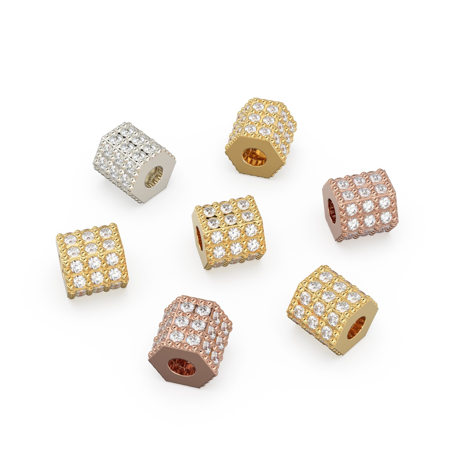 Thank you for coming in! 14k solid yellow three-lane diamond-studded gold diamond eternity spacers, a staple finding for your high-end gold jewelry! Stamped "14k" or 18k! Size: 4.60mm x 4.30mm (2mm hole size) Weight: 0.55 grams (14k), 0.65 grams (18k) Diamond Size: 1mm MATERIAL: 14k or 18k Solid Yellow Gold, Genuine Natural diamonds * Please note that Gold orders are made to order in your choice of Gold KT / Color & Beads drilled to choice so please look at handling time carefully before placing orders.