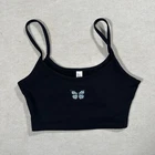 Hey Babe Y2K Black Spaghetti Strap Crop Tank Top With Blue Butterfly Patch 95% cotton, 5% spandex Made in China RN# 158022 STYLE# 1565H2 Please see photos for further details