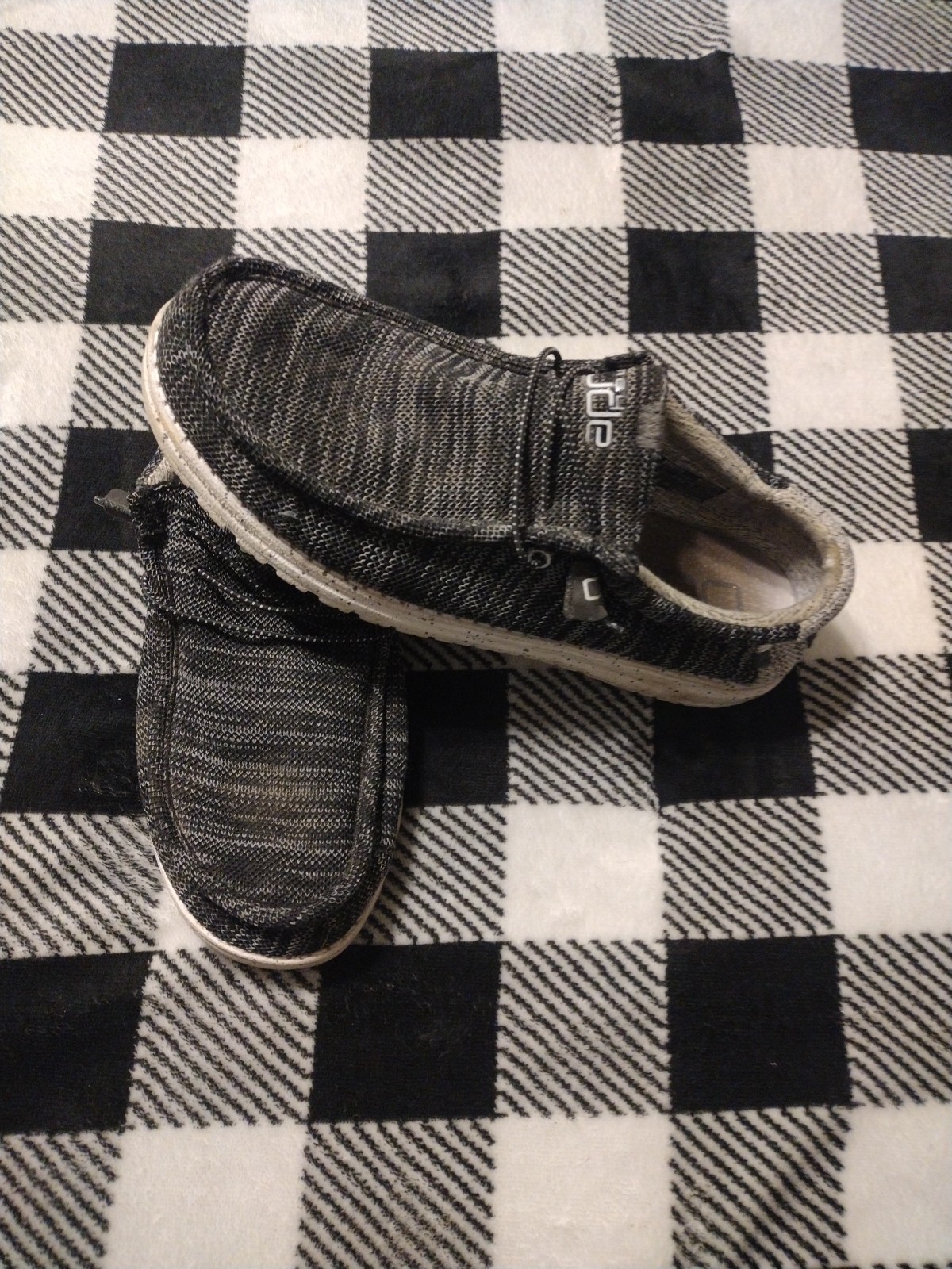 The Hey Dude Men's Wally Stretch Meteorite Black Gray Slip On Shoes in size 11 are casual and comfortable slip-on shoes ideal for everyday wear. Made with a cotton blend upper material and featuring a stretch design, these shoes provide a snug fit and easy wear. The black color and slide style add a modern touch to the classic slip-on design, making them a versatile choice for any casual outfit. Perfect for men looking for a stylish and practical shoe option.
