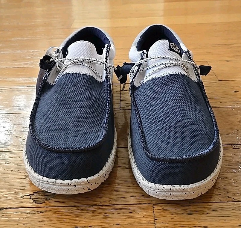 The Hey Dude Wally Tri Varsity Men's Shoes in size 8M are casual slip-on shoes in a stylish blue and grey colorblock design. Featuring a round toe shape, drawstring closure, and lace accents, these lightweight and comfortable shoes are perfect for travel and everyday wear. Made with stretch material and adjustable features, they are designed for the summer, fall, and spring seasons. The Hey Dude brand is known for its quality and attention to detail, making these shoes a great choice for men looking for a versatile and comfortable footwear option.