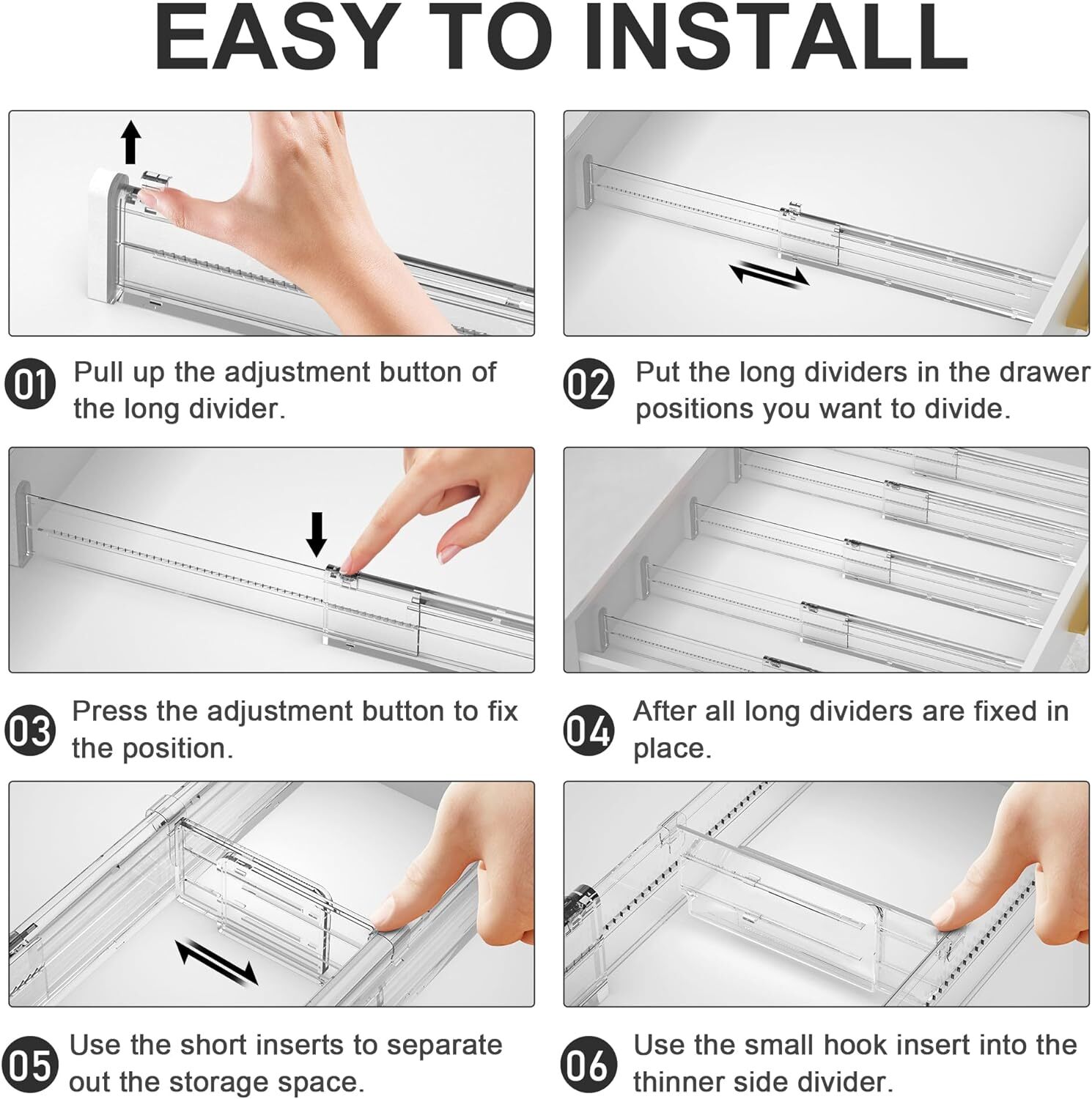 These drawer dividers are a game-changer! They're super easy to assemble and adjust, fitting perfectly in any drawer. The clear design keeps everything visible while organizing utensils, socks, or makeup neatly. Lightweight yet sturdy, they make tidying up a breeze. Love how versatile and secure they are—definitely worth it!