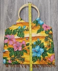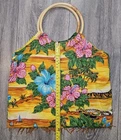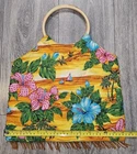The Hibiscus Island Ocean Boats Hand-crafted Boho Bag features a medium-sized rectangular shape with a unique tropical beach pattern, perfect for a party or cocktail occasion. The bag is handmade with rayon fabric and accented with beads, sequins, and beaded fringe on the bottom for added flair. The multicolor hardware and bamboo handles add a boho touch to the design. This vintage-inspired bag also includes a zippered pocket inside and a pouch accessory, making it both stylish and functional for any summer outing.
