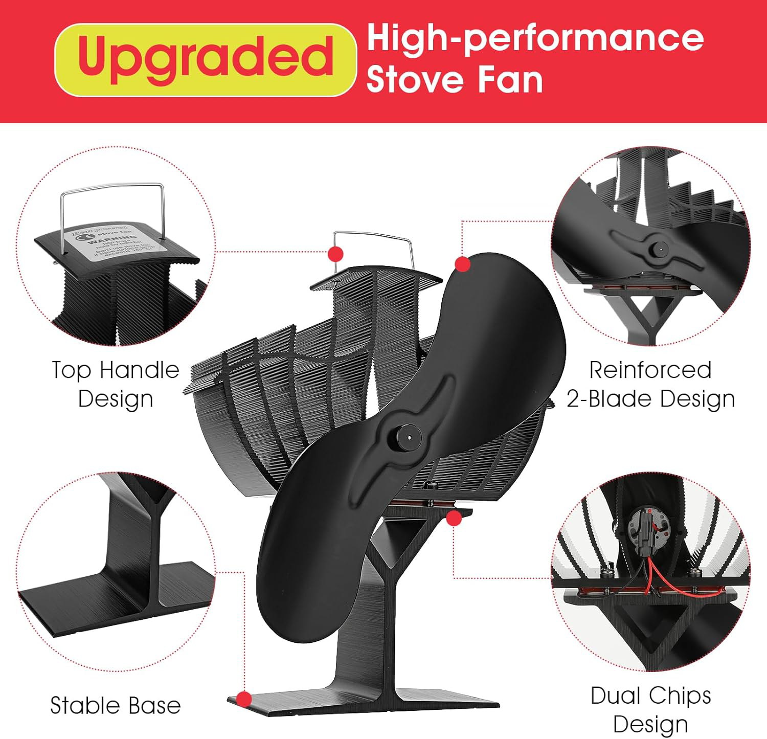 Upgraded Large Airflow: The newly upgraded fireplace fan is made of premium aluminum components and adopts a dual-chip design, which provides a longer, more stable and durable motor. It can reach an airflow of 250 CFM Premium Quality: Our wood stove fan is made of high-quality anodized aluminum, which is rust-proof and has excellent thermal conductivity. The dual-chip design makes the motor more durable and efficient. It is larger in size and heavier than other ordinary fans on the market, making it more sturdy and durable, Our stove fan can increase the speed of room heating by 45% Upgraded 2-blade Design: The Large size 2-blade design reduces the resistance of the motor, further improves the performance and prolongs the life of the motor, and it's heavier, sturdier, and more efficient than a normal 4-blade fan Less consumption and Economical: No batteries or electricity needed, our Wood Stove Fan is powered by heat generated from the stove. When the stove temperature reaches a certain range, the fan will start rotating automatically. Through the rapid rotation of the fan, the warm air will circulate quickly in the room, making you feel warmer. It can help you save you up to 18% in fuel with more efficient distribution of heat from your wood stove Ultra-Quiet Motor Operating: As the blades are the only moving components, even at the highest speed, the operational noise of the log burner fan is lower than 25 db. You may not even feel the presence of the furnace fan, but you will still sense a gentle breeze. The rotation of the fan facilitates air circulation, circulating heat to all around and making you feel warmer On Dec 30, 2025 at 21:55:14 PST, seller added the following information: On Jan 11, 2026 at 22:25:05 PST, seller added the following information: